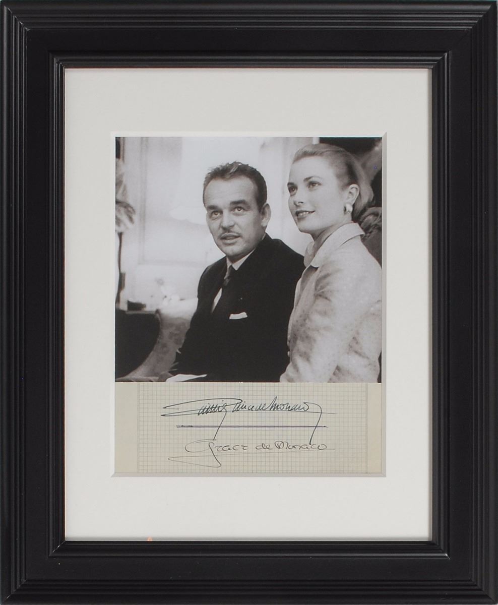 Large fountain pen signatures, “Grace de Monaco” and “Rainier Prince de Monaco,” on a gridded 8 x 10 sheet bearing an affixed portrait of the couple. Nicely matted and framed. In fine condition.