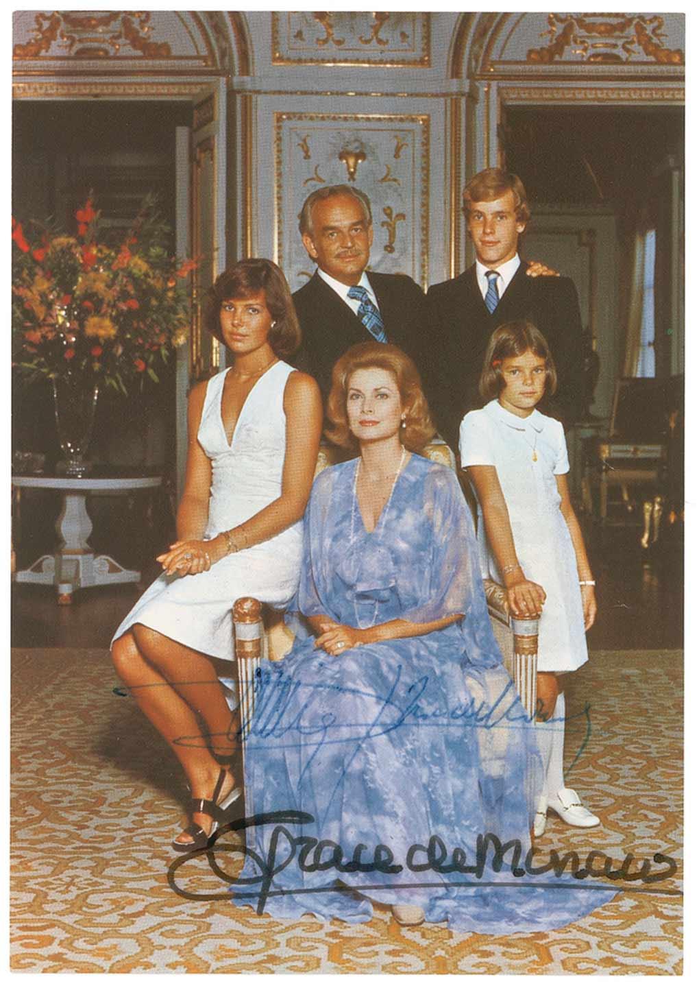 Color 4.25 x 6 paperstock postcard photo of the royal family, signed in black felt tip, “Grace de Monaco,” and in blue ink by Prince Rainier. In fine condition.