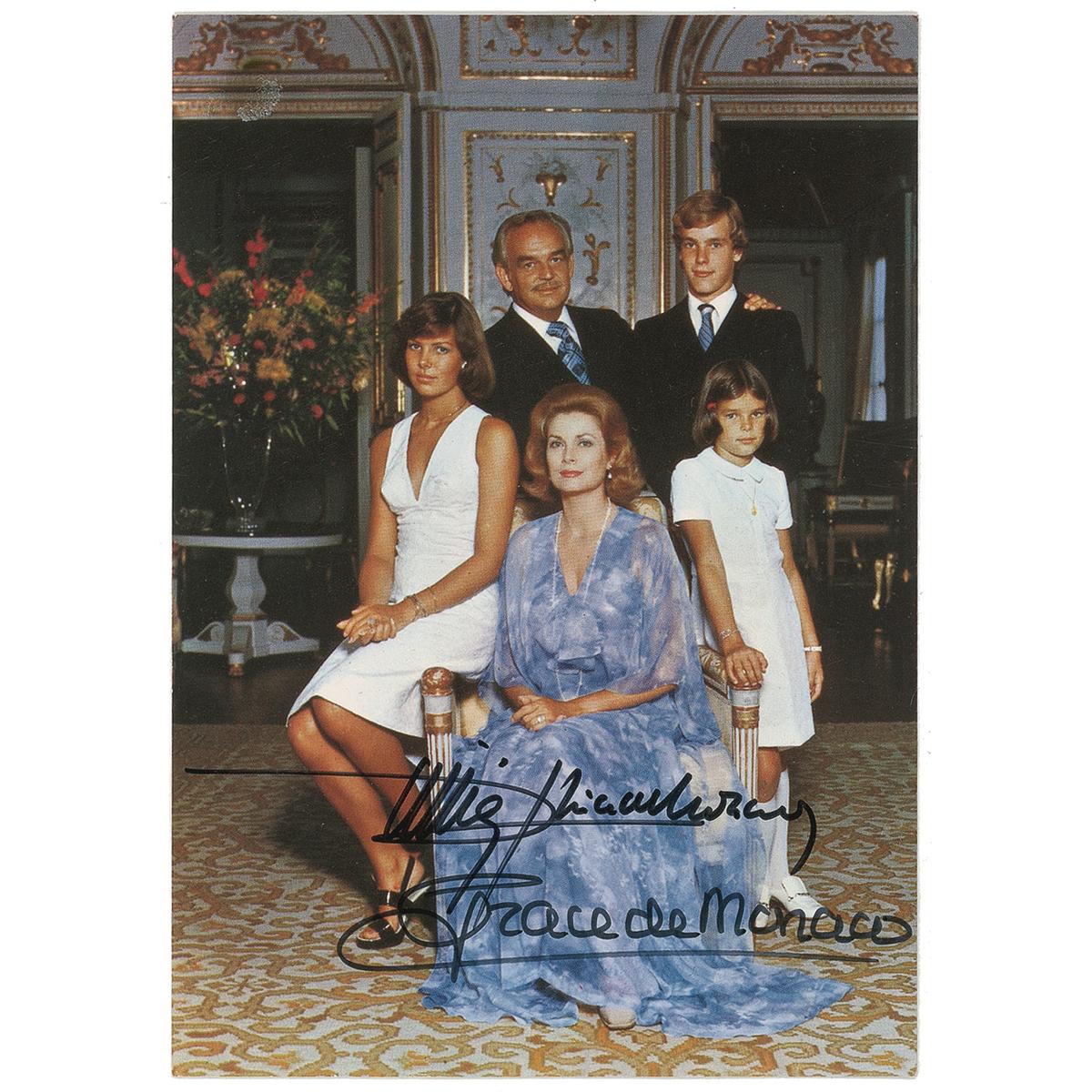 Color 4 x 6 postcard photo of the Royal Family, signed in black felt tip, “Grace de Monaco.” Also signed by Prince Rainer. In fine condition, with a few surface impressions and a small crease at the left edge.