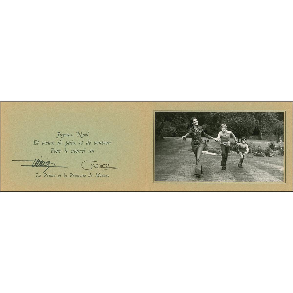 Christmas card, measuring 7 x 4.25 closed, with a royal crest on the front. Inside bears a 6.25 x 3.25 photo of the royal offspring running on a lawn and a pre-printed Christmas sentiment, in French, opposite the photo. Signed at the conclusion in black felt tip, “Grace,” and also signed by Prince Rainier. In fine condition, with mild toning to inside and both covers.
