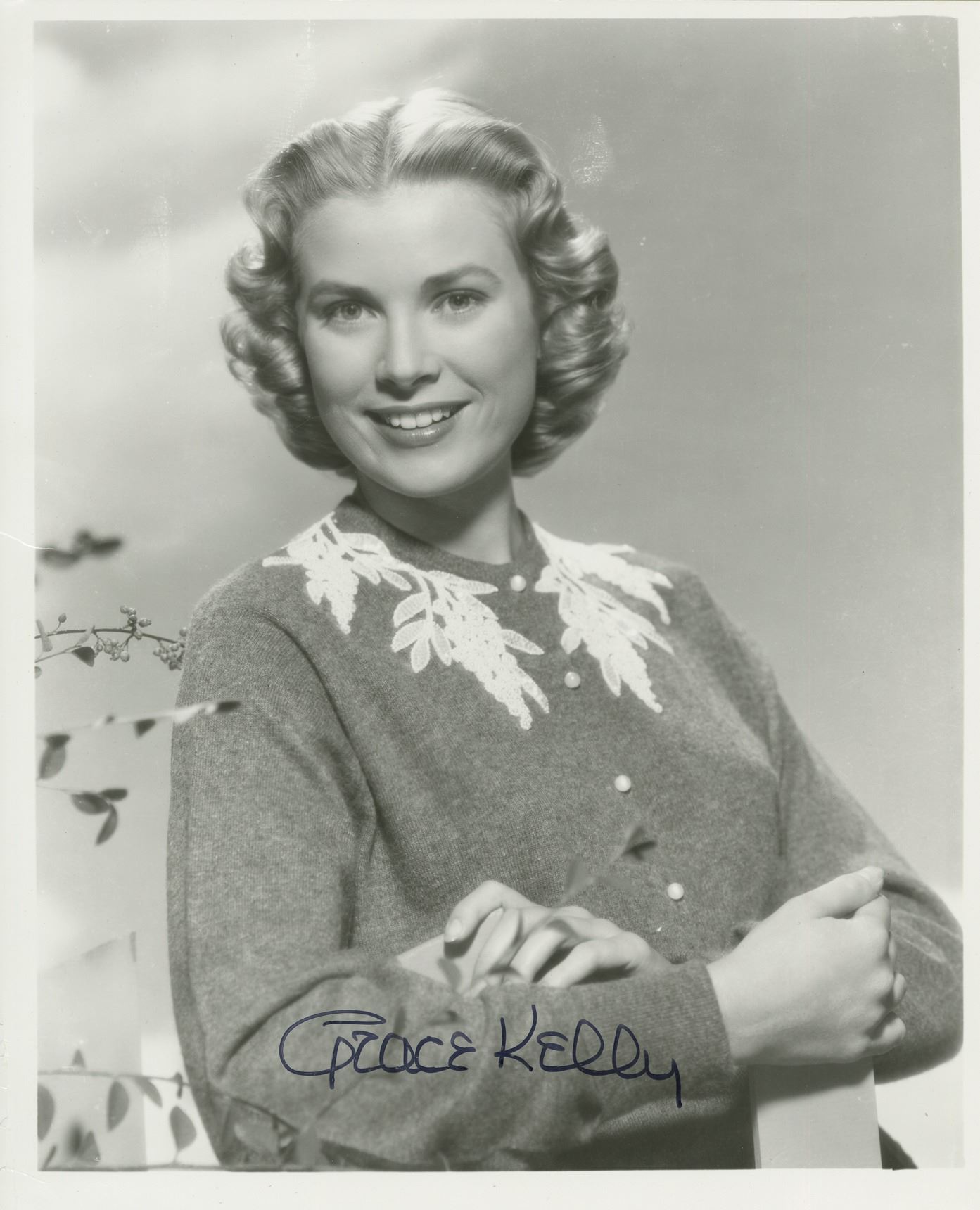 184. Grace Kelly signed photograph. (1950s) Vintage original gelatin silver 8 x 10 in. photograph depicting the glamorous Kelly in the early days of her career. Signed boldly in black ink at the lower center, "Grace Kelly". Exhibiting minor age with some creasing to the blank borders. In vintage very good to fine condition. $700 - $900