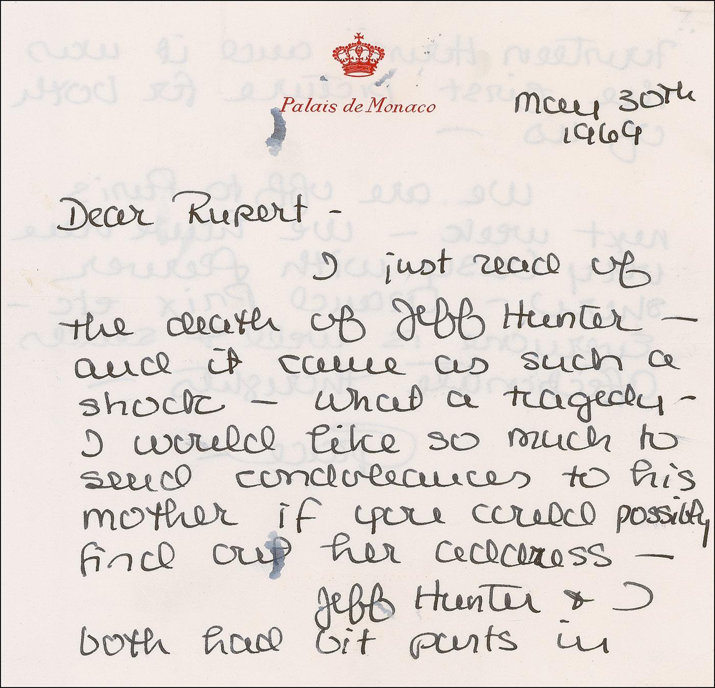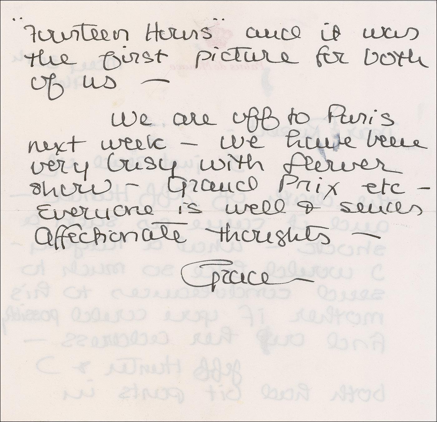 ALS signed “Grace,” one page both sides, 6.75 x 6.5, Palais de Monaco letterhead, May 30, 1969. Letter to Rupert Allan in Beverly Hills. In full: “I just read of the death of Jeff Hunter–and it came as such a shock–What a tragedy–I would like so much to send condolences to his mother if you could possibly find out her address–Jeff Hunter & I both had bit parts in ‘Fourteen Hours’ and it was the first picture for both of us–We are off to Paris next week–We have been very busy with flower show– Grand Prix etc–Everyone is well & sends affectionate thoughts.” In fine condition, with a few small ink blots to letter, not affecting legibility, and some scattered light creases and wrinkles. Accompanied by the original mailing envelope addressed in Kelly’s hand.