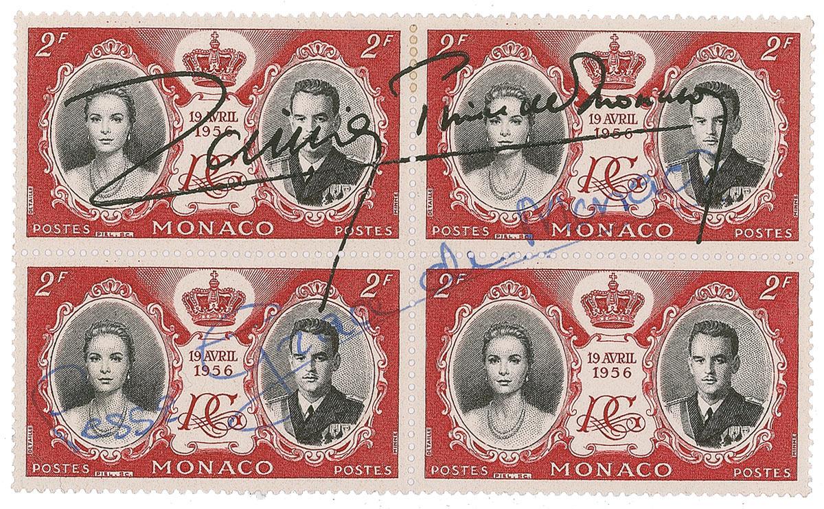 Block of four Monaco postage stamps commemorating the marriage of Kelly to Prince Rainier, 4 x 2.5, signed in blue ink, “Grace de Monaco,” and also signed in black ink by Prince Rainier. Mild overall contrast to Kelly’s signature, otherwise fine condition.