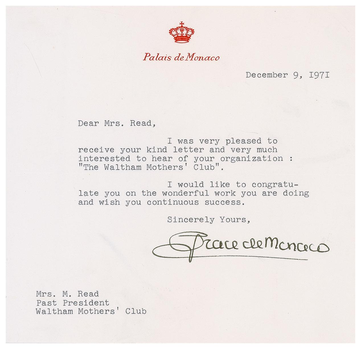 TLS signed “Grace de Monaco,” one page, 6.75 x 6.5, Palais de Monaco letterhead, December 9, 1971. Letter to the past president of the Waltham Mothers’ Club. In full: “I was very pleased to receive your kind letter and very much interested to hear of your organization: ‘The Waltham Mothers’ Club.’ I would like to congratulate you on the wonderful work you are doing and wish you continuous success.” In fine condition. Accompanied by the original mailing envelope and two unsigned FDCs.