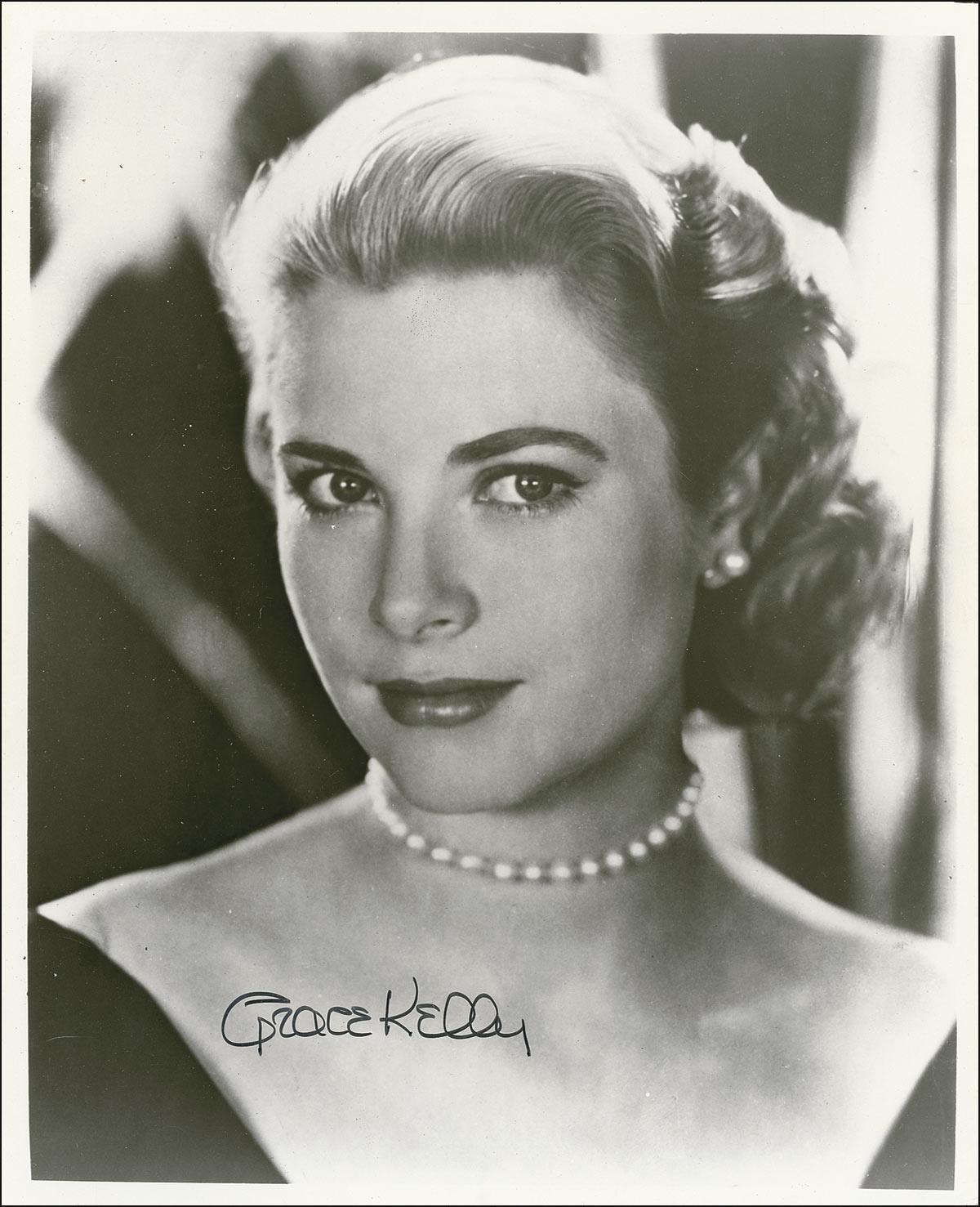 Glossy 8 x 10 head-and-shoulders photo, signed in black felt tip, “Grace Kelly.” Scattered creases and surface marks, otherwise fine condition. This beautiful glossy image is from the Hitchcock classic Rear Window.
