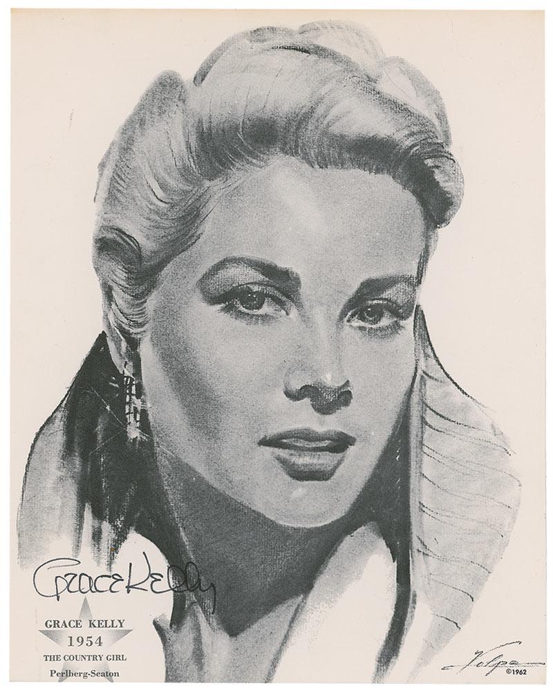Striking Volpe print, 8 x 10, picturing Grace Kelly from her 1954 film, The Country Girl, signed in black felt tip. In very good condition, with surface creasing, uniform soiling along the top border, and a tear towards the right corner.