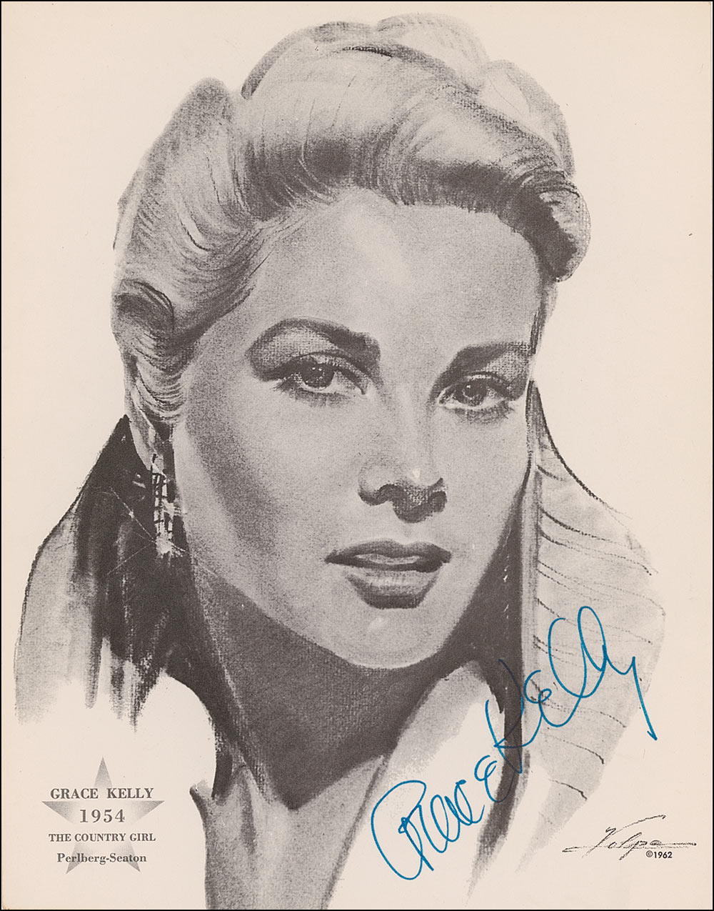 Striking Volpe print, 8.25 x 10.5, picturing Grace Kelly from her 1954 film, The Country Girl, signed in blue felt tip. In fine condition, with light bends and a bit of edge toning.