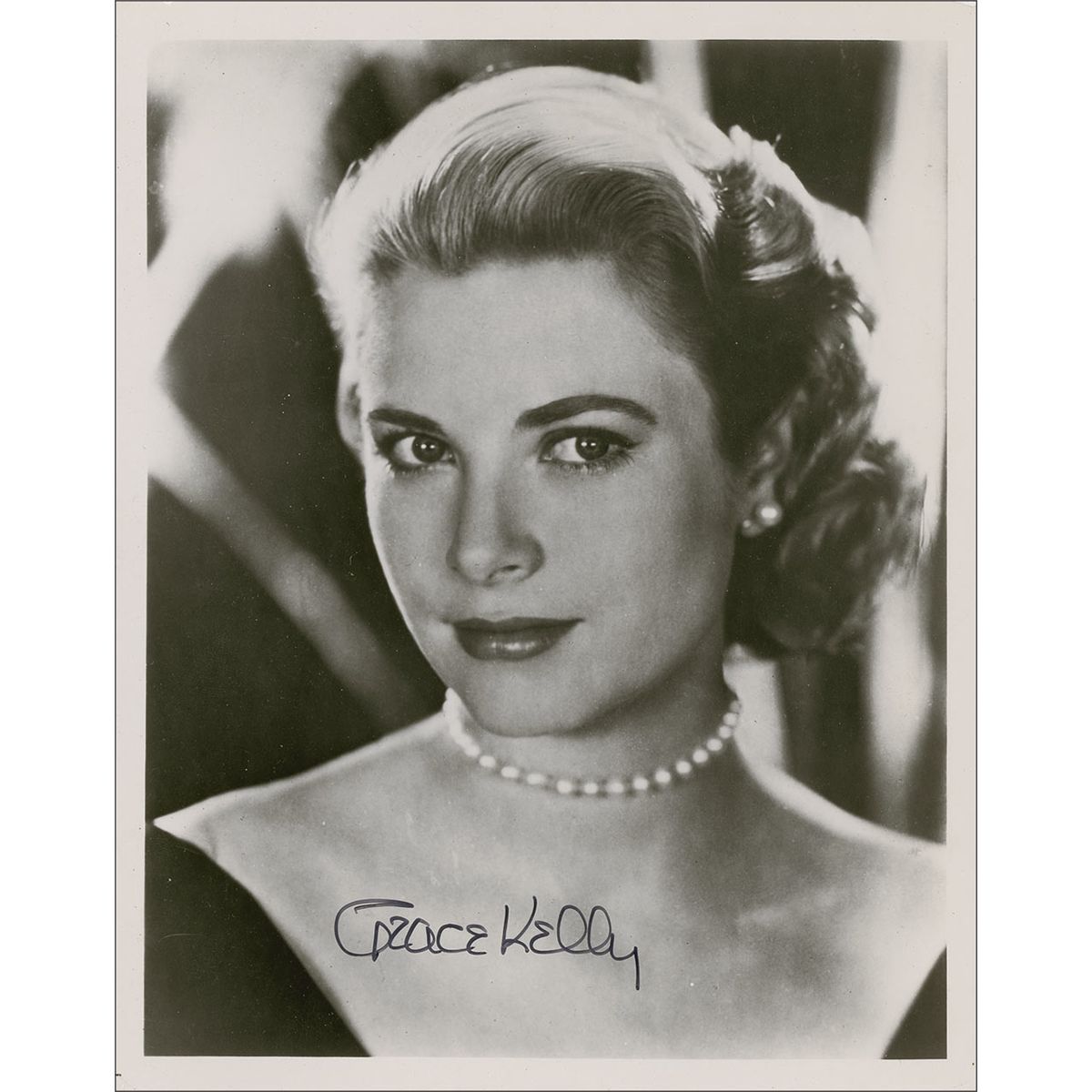 Charming glossy 8 x 10 head-and-shoulders photo, signed in black felt tip, “Grace Kelly.” Some scattered light creases, surface marks, and impressions, otherwise fine condition.