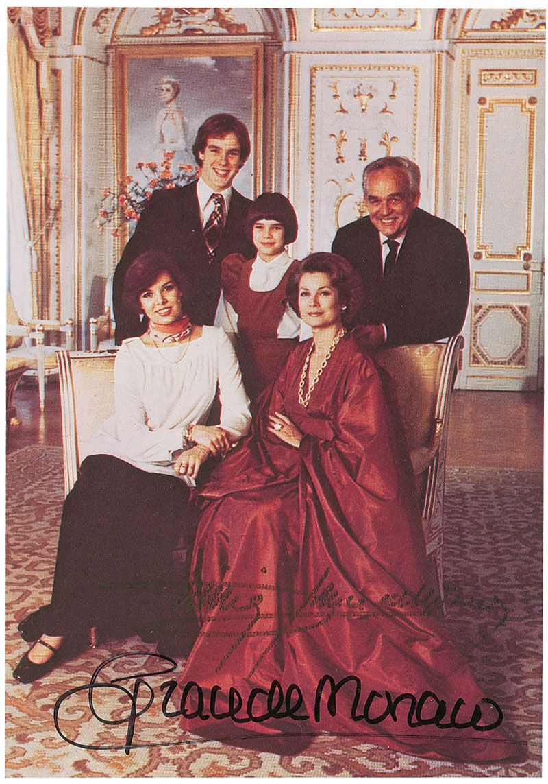 Color 4 x 6 paperstock postcard photo of the royal family, signed in black felt tip, “Grace de Monaco,” and also signed by Prince Rainier. In fine condition, with irregular adhesion to Rainier’s signature, which is also light, but mostly legible. Accompanied by the original mailing envelope as well as a pre-printed note.
