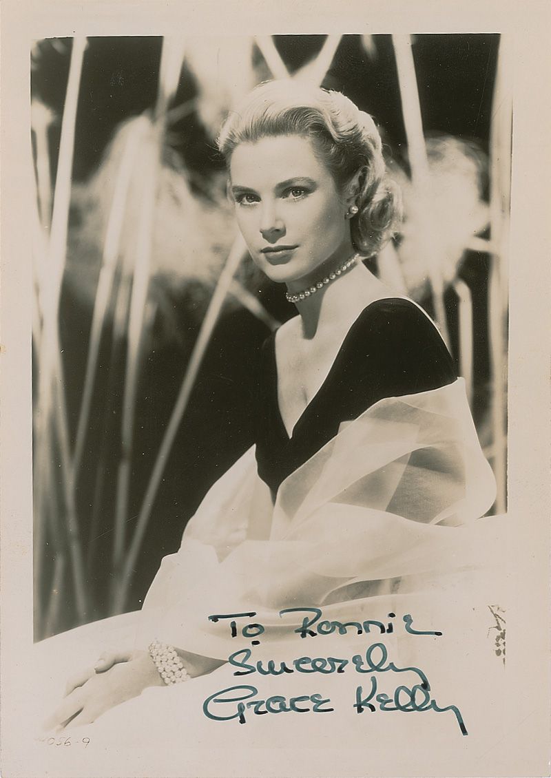 Vintage glossy 5 x 7 photo, signed and inscribed in fountain pen “To Ronnie, Sincerely, Grace Kelly.” In fine condition, with a few scattered light creases and surface marks.