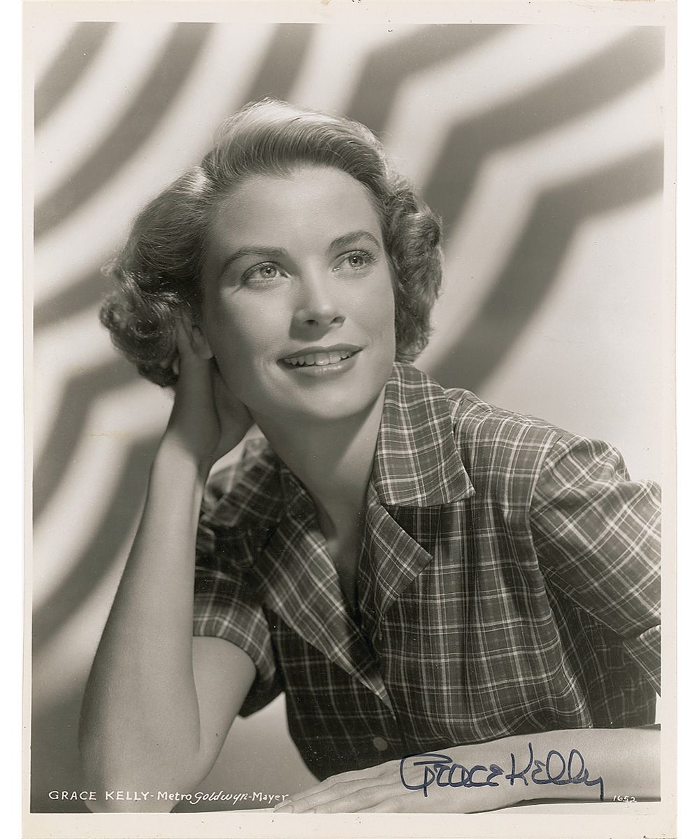 Attractive glossy 7.75 x 10 MGM photo of Kelly in a plaid shirt, signed in black felt tip. Some creases in the upper right corner, trimmed left edge, a ding in the bottom border, and small tape remnants on reverse, otherwise fine condition.