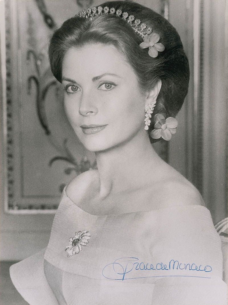 Gorgeous semi-glossy 6.75 x 9 photo of Princess Grace, signed in blue felt tip, “Grace de Monaco.” Affixed to a same-size mount. In fine condition.