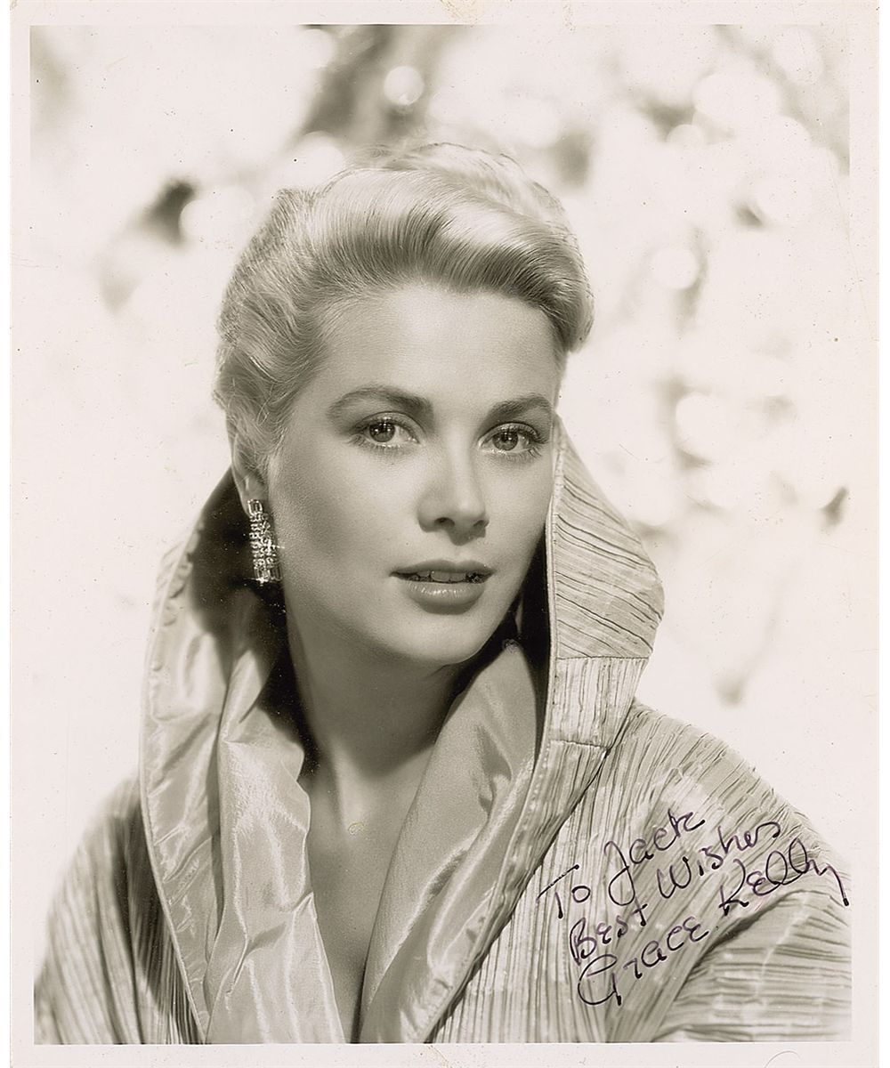 Vintage glossy 8 x 10 photo of Kelly wearing a satin, high-collared jacket with dangling rhinestone earrings, signed and inscribed in fountain pen, “To Jack, Best wishes, Grace Kelly.” Affixed to a same-size acid-free linen backing. In fine condition, with scattered traces of professionally smoothed creases (affecting only the border areas). This pose was taken in 1954 by Paramount photographer Bud Fraker for the film To Catch a Thief. An exceptionally beautiful piece.