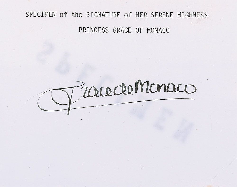 Ink signature, “Grace de Monaco,” on an off-white 5.25 x 4 card bearing a typed notation at the top. In fine condition, with show-through from an ink stamp to reverse. Accompanied by a lovely unsigned photo.