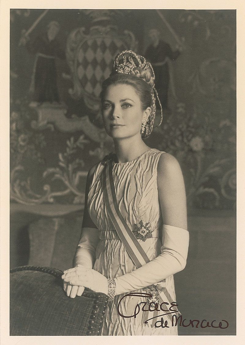 Gorgeous matte-finish 5 x 7 three-quarter-length portrait of Princess Grace, signed in the lower right in fountain pen, “Grace de Monaco.” In very fine condition.