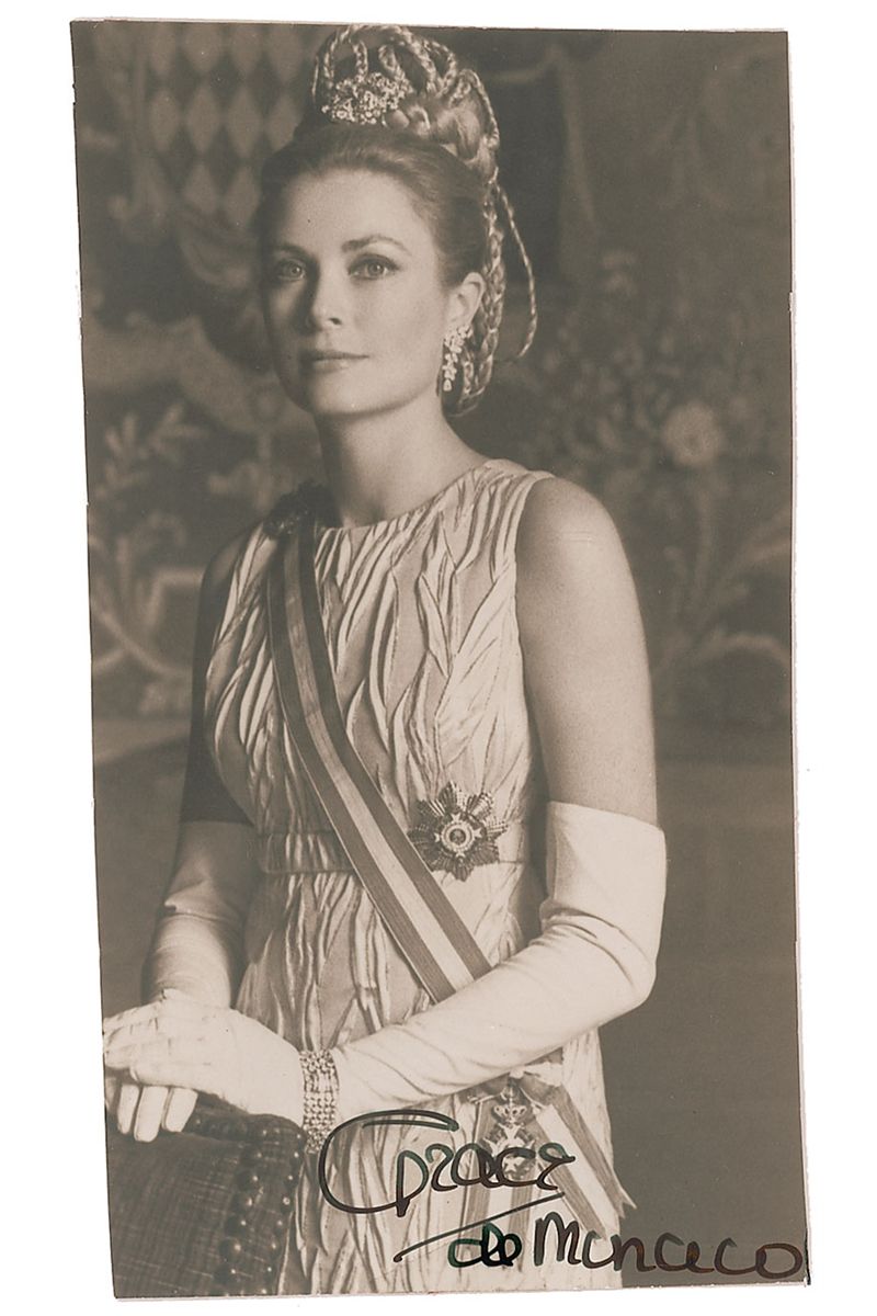 Matte-finish 3 x 5.5 photo of Kelly in a royal gown, signed in black ink, “Grace de Monaco.” In fine condition, with trimmed edges and a small piece of tape to bottom edge over a small portion of signature.