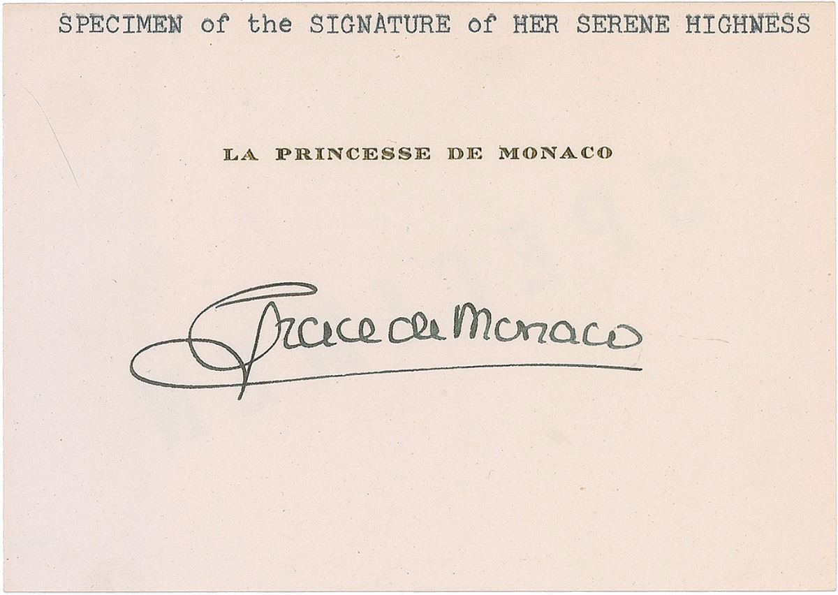 Ink signature, “Grace de Monaco,” on an off-white 5.25 x 3.75 personal stationery card, with a typed caption at the top, “Specimen of the Signature of Her Serene Highness.” Stamped on the reverse, “Specimen.” In fine condition, with trivial show-through from stamp to reverse.