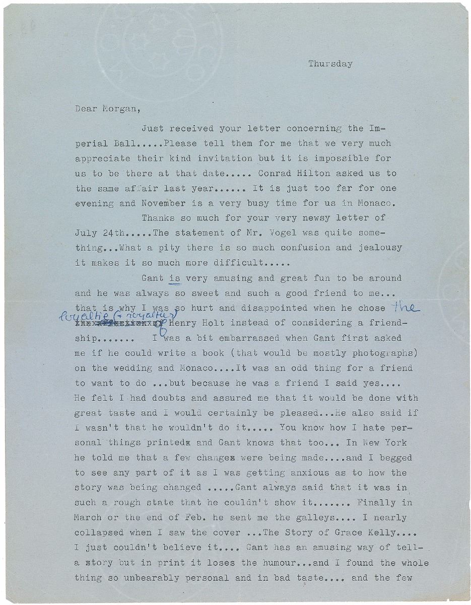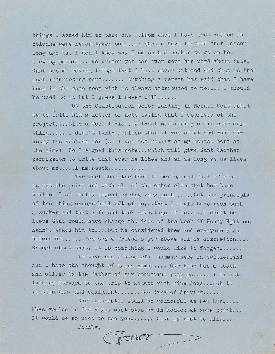 TLS signed “Grace,” two pages, 8.25 x 10.5, no date but circa August/September 1957. Letter to Kelly's MGM press agent, Morgan Hudgins, in part: “Gant is very amusing and great fun to be around and he was always so sweet and such a good friend to me. That is why I was so hurt and disappointed when he chose the loyaltie (& royalties) of Henry Holt instead of considering a friendship—I was a bit embarrassed when Gant first asked me if he could write a book (that would be mostly photographs) of the wedding and Monaco—It was an odd thing for a friend to want to do but because he was a friend I said yes. He felt I had doubts and assured me that it would be done with great taste and I would certainly be pleased—He also said if I wasn't that he wouldn't do it—You know how I hate personal things printed and Gant knows that too—In New York he told me that a few changes were being made—and I begged to see any part of it as I was getting anxious as to how the story was being changed—Gant always said that it was in such a rough state that he couldn't show it—Finally in March or the end of Feb. He sent me the galleys—I nearly collapsed when I saw the cover—The Story of Grace Kelly—I just couldn't believe it—Gant has an amusing way of tell-[ing] a story but in print it loses the humour—and I found the whole thing so unbearably personal and in bad taste—and the few things I asked him to take out—from what I have seen quoted in columns were never taken out—I should have learned that lesson long ago but I don't know why I am such a sucker to go on believing people—No writer yet has ever kept his word about cuts. Gant has me saying things that I have never uttered and that is the most infuriating part—Anything a person has said that I have been in the same room with is always attributed to me—I should be used to it but I guess I never will.