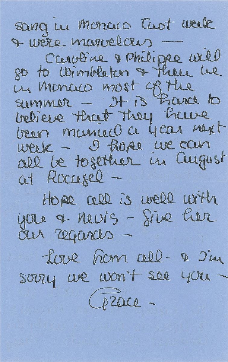 ALS signed “Grace,” two pages on two adjoining sheets, 5.25 x 8.25, Square de l'Avenue Foch letterhead, June 24, [1979]. Letter to Mrs. Marcel Palmaro. In part: “Thank you for your sweet invitation to visit this summer—unfortunately we are unable to accept…Stephie will go to camp in the Poconos & Albie is touring with the Amherst Glee Club. They sang in Monaco last week & were marvelous—Caroline & Philippe will go to Wimbledon & then be in Monaco most of the summer.” In fine condition. Accompanied by the original mailing envelope, addressed in her own hand.
