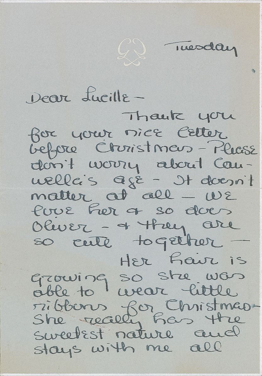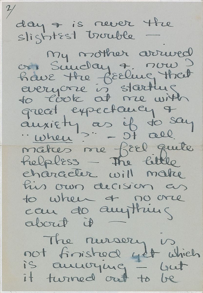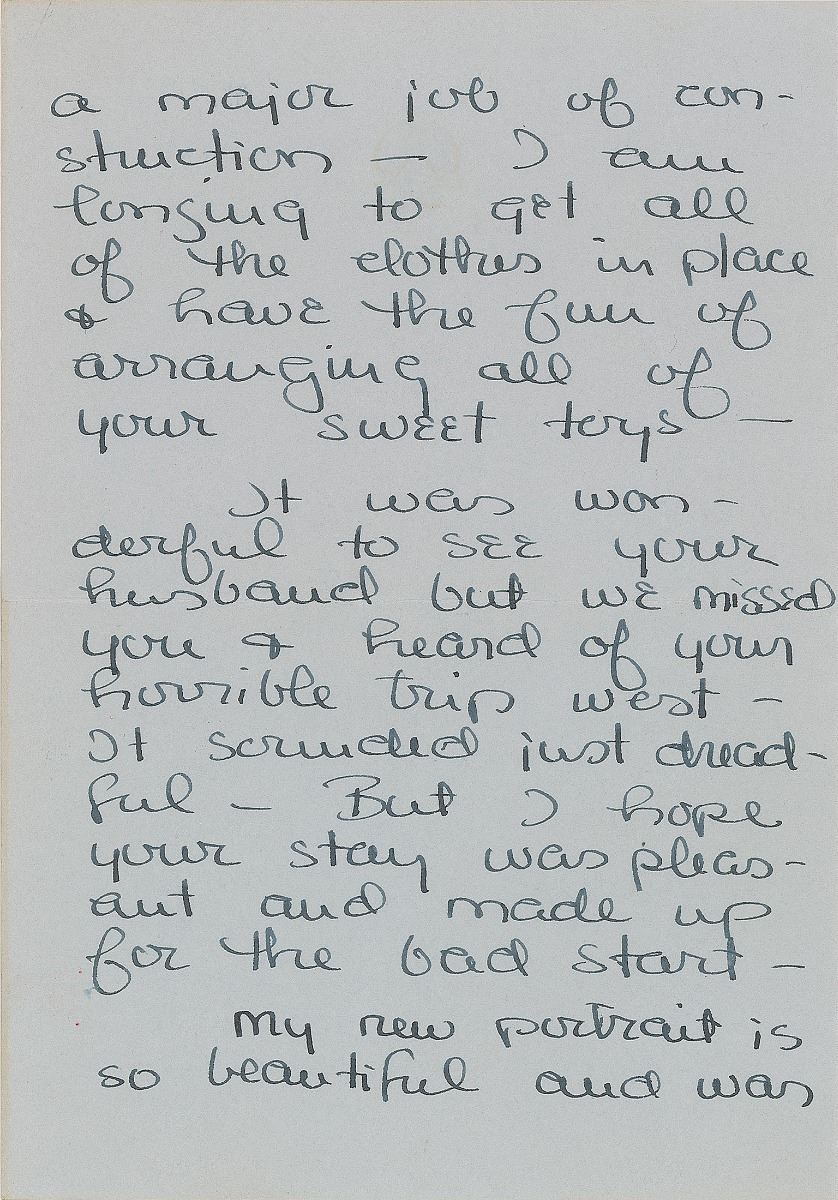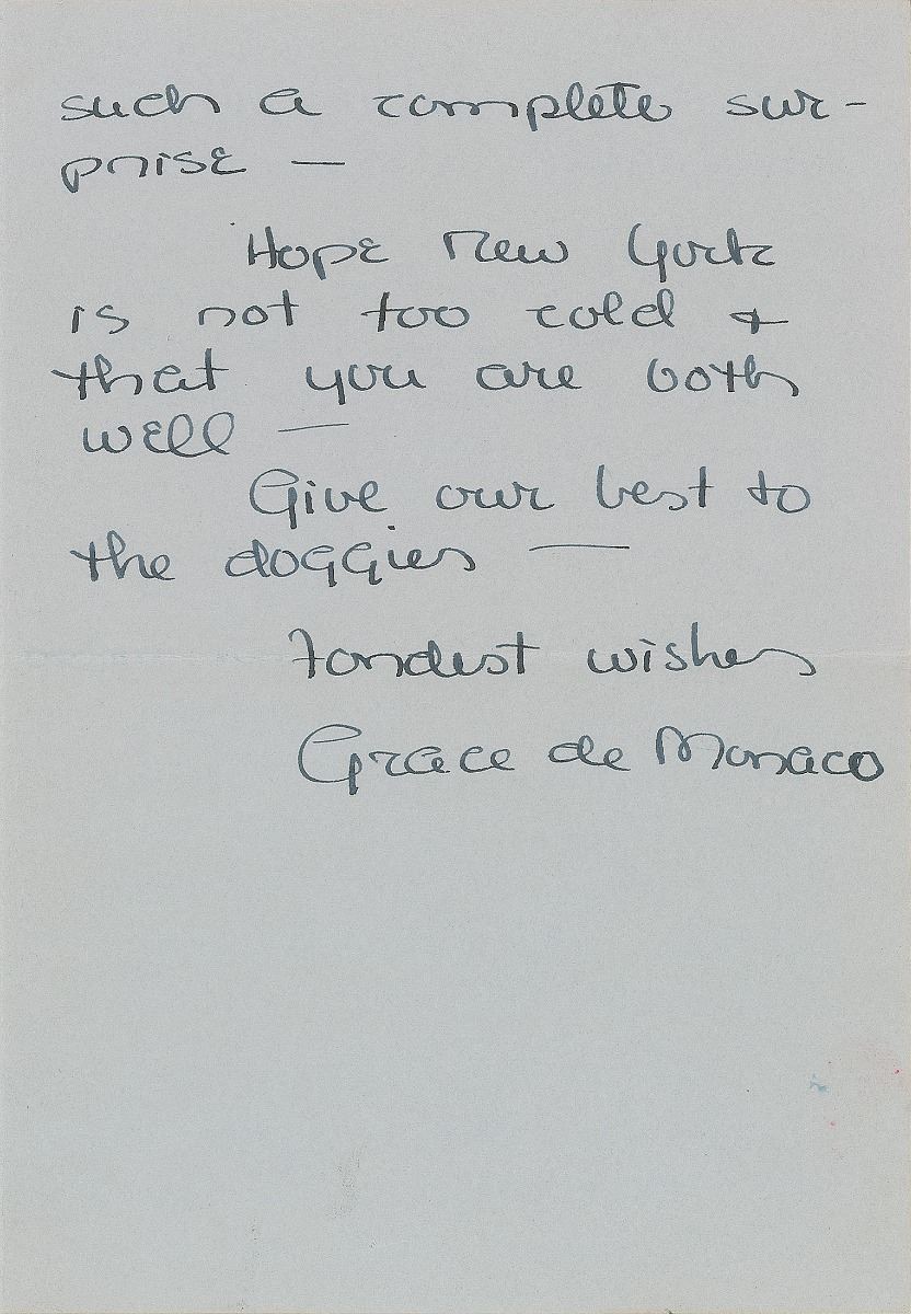 ALS signed “Grace de Monaco,” four pages on two adjoining sheets, 5 x 7.25, personal monogrammed letterhead, no date but circa 1958. Letter to Lucille, in part: “My mother arrived on Sunday & now I have the feeling that everyone is starting to look at me with great expectancy & anxiety as if to say’ when’?—It all makes me feel quite helpless—The little character will make his own decision as to when & no one can do anything about it—The nursery is not finished yet which is annoying—but it turned out to be a major job of construction—I am longing to get all of the clothes in place & have the fun of arranging all of your sweet toys.” In fine condition. Kelly gave birth to her only son Albert Alexandre Louis Pierre, the current Prince of Monaco, on March 14, 1958.