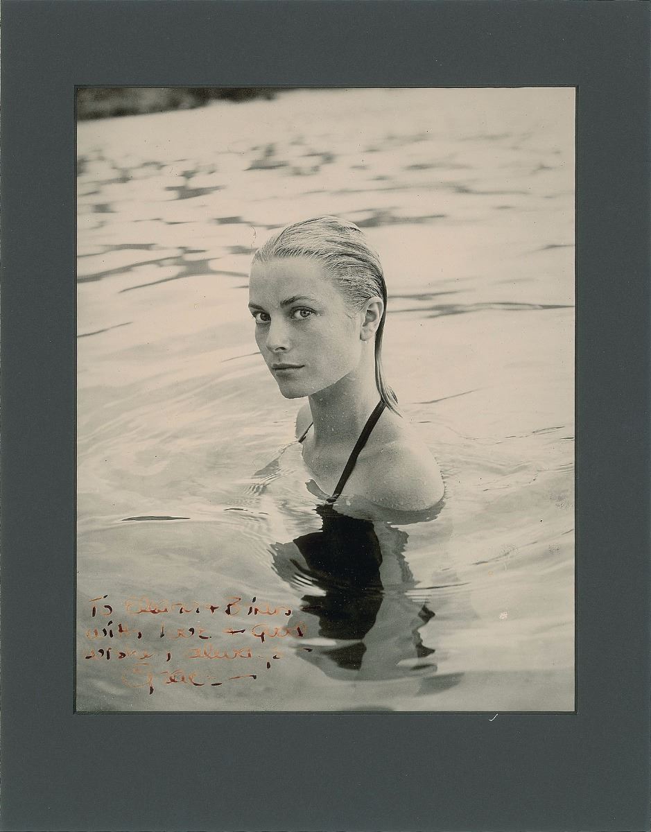 Beautiful glossy 7 x 8.75 photo of Kelly up to her shoulders in water, signed and inscribed in fountain pen, "To Eleanor & Brian, with love & good wishes always—Grace—.” Matted and in very good to fine condition, with trimmed edges, emulsion loss to upper and lower left corners (covered by the mat), and the handwriting faded but still legible. Pre-certified PSA/DNA.