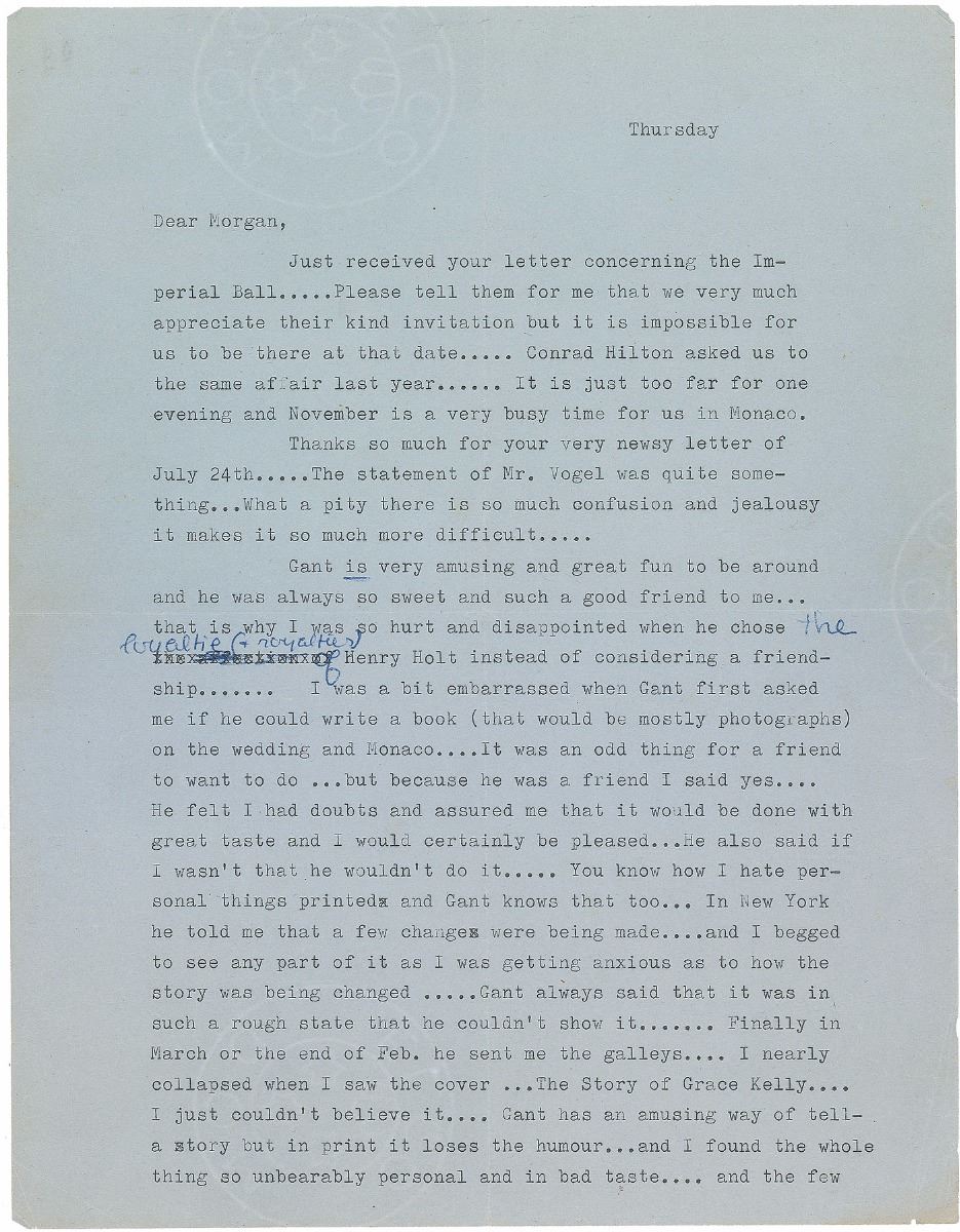 TLS signed “Grace,” two pages, 8.25 x 10.5, no date but circa August/September 1957. Letter to Kelly's MGM press agent, Morgan Hudgins, in part: “Gant is very amusing and great fun to be around and he was always so sweet and such a good friend to me. That is why I was so hurt and disappointed when he chose the loyaltie (& royalties) of Henry Holt instead of considering a friendship—I was a bit embarrassed when Gant first asked me if he could write a book (that would be mostly photographs) of the wedding and Monaco—It was an odd thing for a friend to want to do but because he was a friend I said yes. He felt I had doubts and assured me that it would be done with great taste and I would certainly be pleased—He also said if I wasn't that he wouldn't do it—You know how I hate personal things printed and Gant knows that too—In New York he told me that a few changes were being made—and I begged to see any part of it as I was getting anxious as to how the story was being changed—Gant always said that it was in such a rough state that he couldn't show it—Finally in March or the end of Feb. He sent me the galleys—I nearly collapsed when I saw the cover—The Story of Grace Kelly—I just couldn't believe it—Gant has an amusing way of tell-[ing] a story but in print it loses the humour—and I found the whole thing so unbearably personal and in bad taste—and the few things I asked him to take out—from what I have seen quoted in columns were never taken out—I should have learned that lesson long ago but I don't know why I am such a sucker to go on believing people—No writer yet has ever kept his word about cuts. Gant has me saying things that I have never uttered and that is the most infuriating part—Anything a person has said that I have been in the same room with is always attributed to me—I should be used to it but I guess I never will.