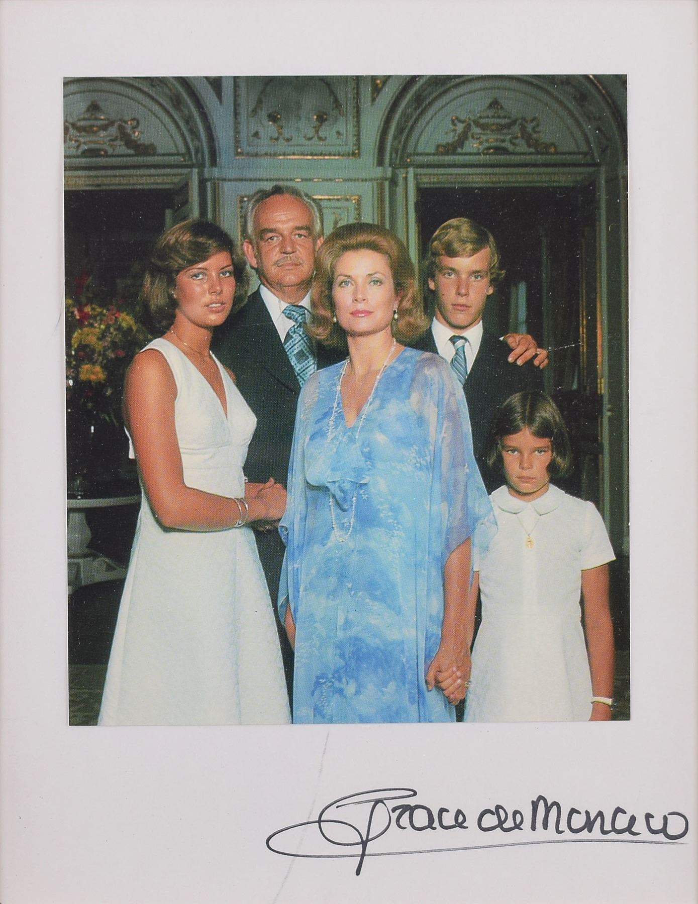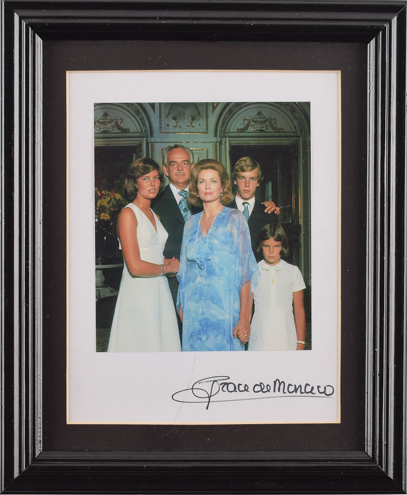 Color semi-glossy 5 x 5.75 photo Grace Kelly and Prince Rainier posing with their three children, signed on the mount in black felt tip, "Grace de Monaco." Matted and framed to an overall size of 9.5 x 11.5. In fine condition, with a stray ink mark passing through the first letter of the signature. Accompanied by a full certificate of authenticity from JSA.