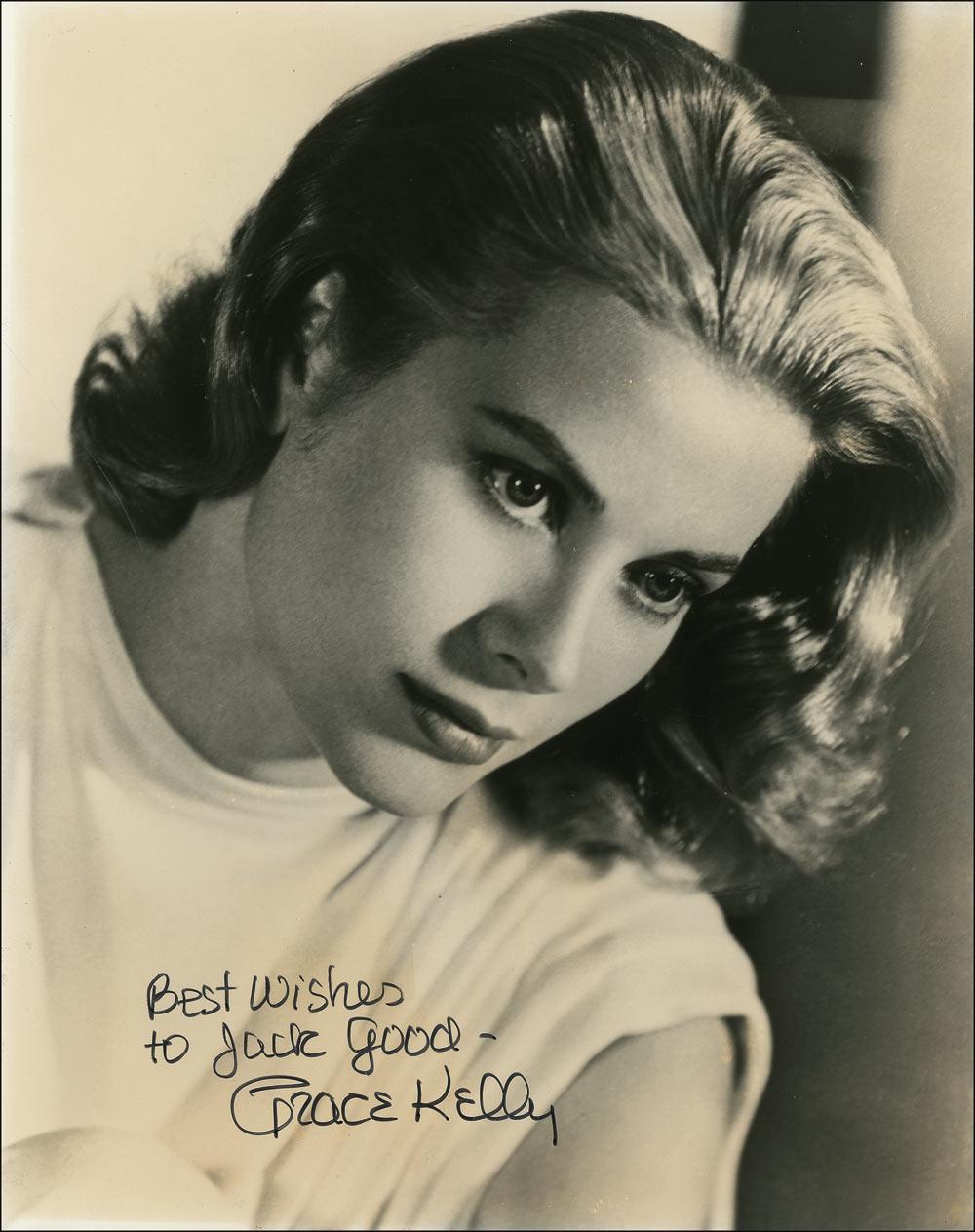 Glossy 8 x 10 portrait of Kelly casting a downward gaze, signed and inscribed in black felt tip, “Best Wishes to Jack Good, Grace Kelly.” Scattered creasing, block of overall toning, and affixed to a same-size piece of cardboard, otherwise fine condition. Pre-certified PSA/DNA and RRAuction COA.