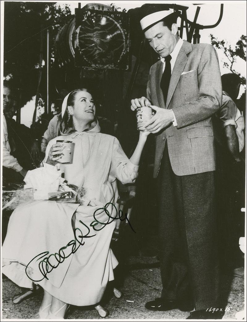 Glossy 7.5 x 9.5 photo of Frank Sinatra offering Kelly candy behind the scenes during production of ‘High Society,’ signed in black felt tip, “Grace Kelly.” In fine condition, with upper left corner crease and very light surface wear.