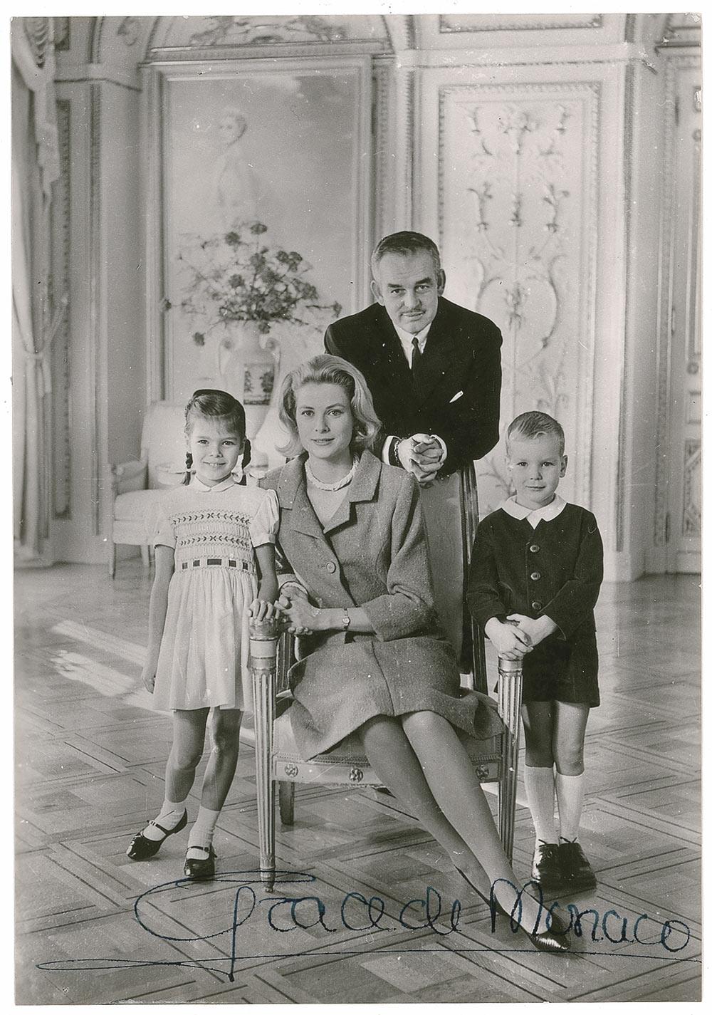 Vintage 4 x 6 postcard photo of Grace, Rainier, Caroline, and Albert, signed in black ink, “Grace de Monaco.” In fine condition, with a small crease to upper portion of image, and just a bit of irregular ink adhesion. Accompanied by the original mailing envelope postmarked September 9, 1964.