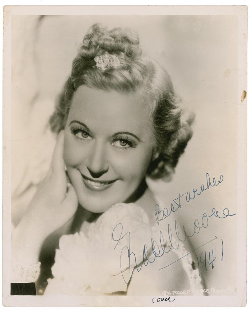 Internationally famous star of the Metropolitan Opera, Broadway, motion pictures, radio and recordings was also known as, and played, ‘The Tennessee Nightingale.’ She died tragically in an airplane crash in 1947. It has been claimed that Elvis Presley's ‘Graceland’ mansion was named in honor of her. Vintage glossy 8 x 10 photo, signed in fountain pen, “Best wishes, Grace Moore 1941.” In very good condition, with scattered creases, surface marks, and impressions and an ink notation to bottom border.