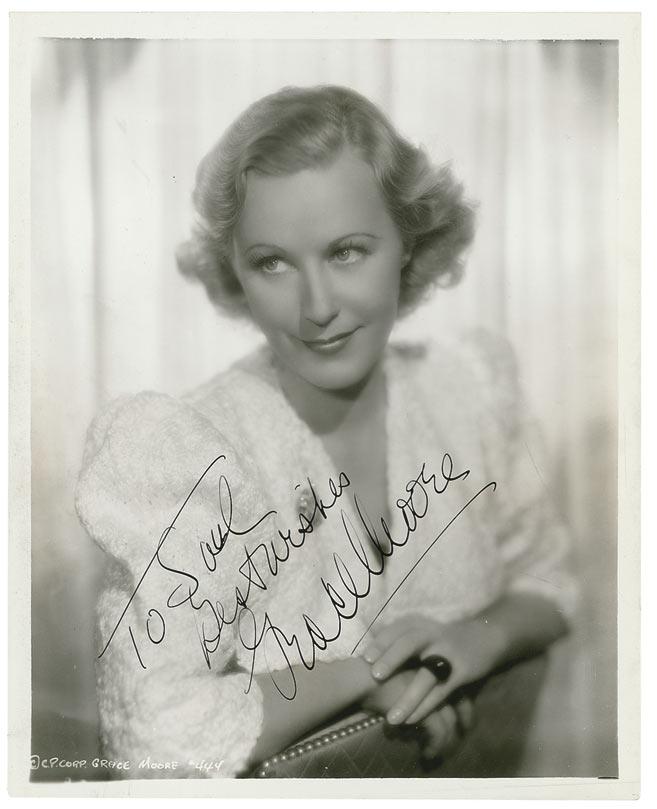 Internationally famous star of the Metropolitan Opera, Broadway, motion pictures, radio and recordings (1898–1947) was also known as, and played, ‘The Tennessee Nightingale.’ She died tragically in an airplane crash in 1947. It has been claimed that Elvis Presley's ‘Graceland’ mansion was named in honor of her. Vintage glossy 8 x 10 photo of Moore kneeling in a chair, signed, and inscribed in-person in fountain pen “To Saul, Best wishes, Grace Moore.” Reverse of photo bears collector’s stamp date of March 25, 1936, the date the signature was acquired. Scattered light surface marks, creases, and impressions, otherwise fine condition. Saul Goodman Collection.