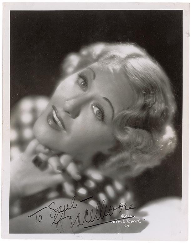Breathless vintage glossy 8 x 10.25 photo, signed and inscribed in-person in fountain pen, “To Saul-Grace Moore.” Reverse of photo bears collector’s ink date of September 1934, the date the signature was acquired. In very good condition, with scattered surface impressions and creases, a few small dings, mild rippling to emulsion, and some light brushing to the signature. Saul Goodman Collection.