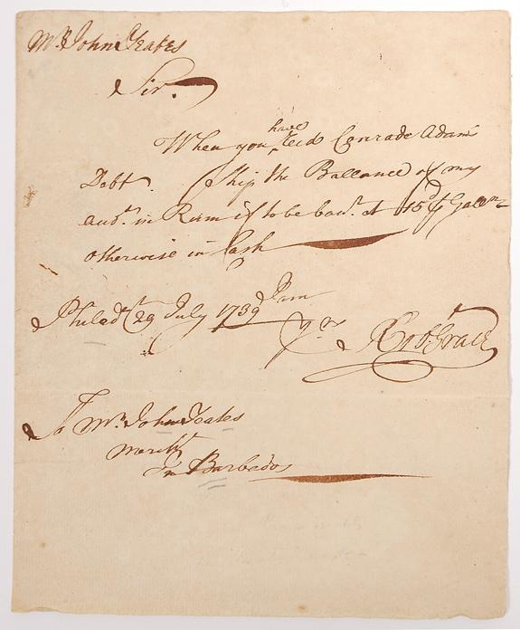 Grace, Robert - A Co-founder of the Library Company of Philadelphia. Autograph letter signed ("Rob. Grace"), one page with integral docket leaf, 7½ x 6", Philadelphia, July 29, 1739. To Mr. John Yeates, a merchant in Barbados, ordering that once Yeats has received the debt owed Grace by Conrad Adams, the balance of Grace's account should be shipped to him in rum if it could be bought at 15 pence per gallon, otherwise to send cash. Minor soiling, else fine. Written on Rittenhouse Paper Mill watermarked paper. Penned and signed boldly in dark ink.