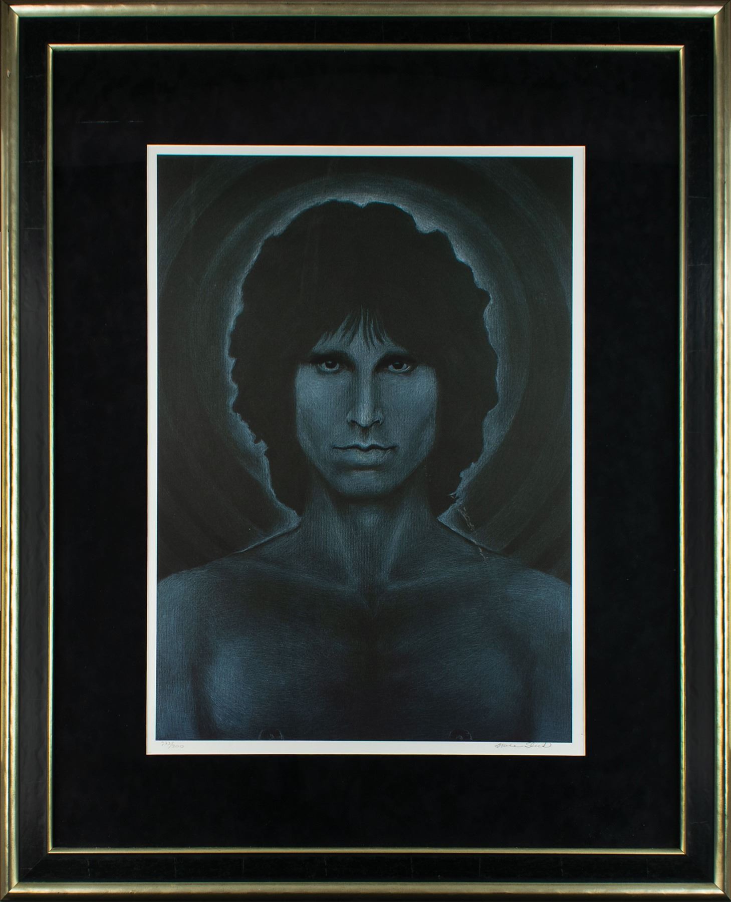 Brilliant limited edition color 21.5 x 30 print of a painting by Grace Slick entitled 'Sacrifice to Morpheus,' numbered 273/300, which depicts Doors frontman Jim Morrison against a dark background with concentric halos of light, signed in the lower border in pencil by Slick. Attractively matted and framed to an overall size of 36.5 x 45.25. In fine condition. Accompanied by a full letter of authenticity from PSA/DNA.