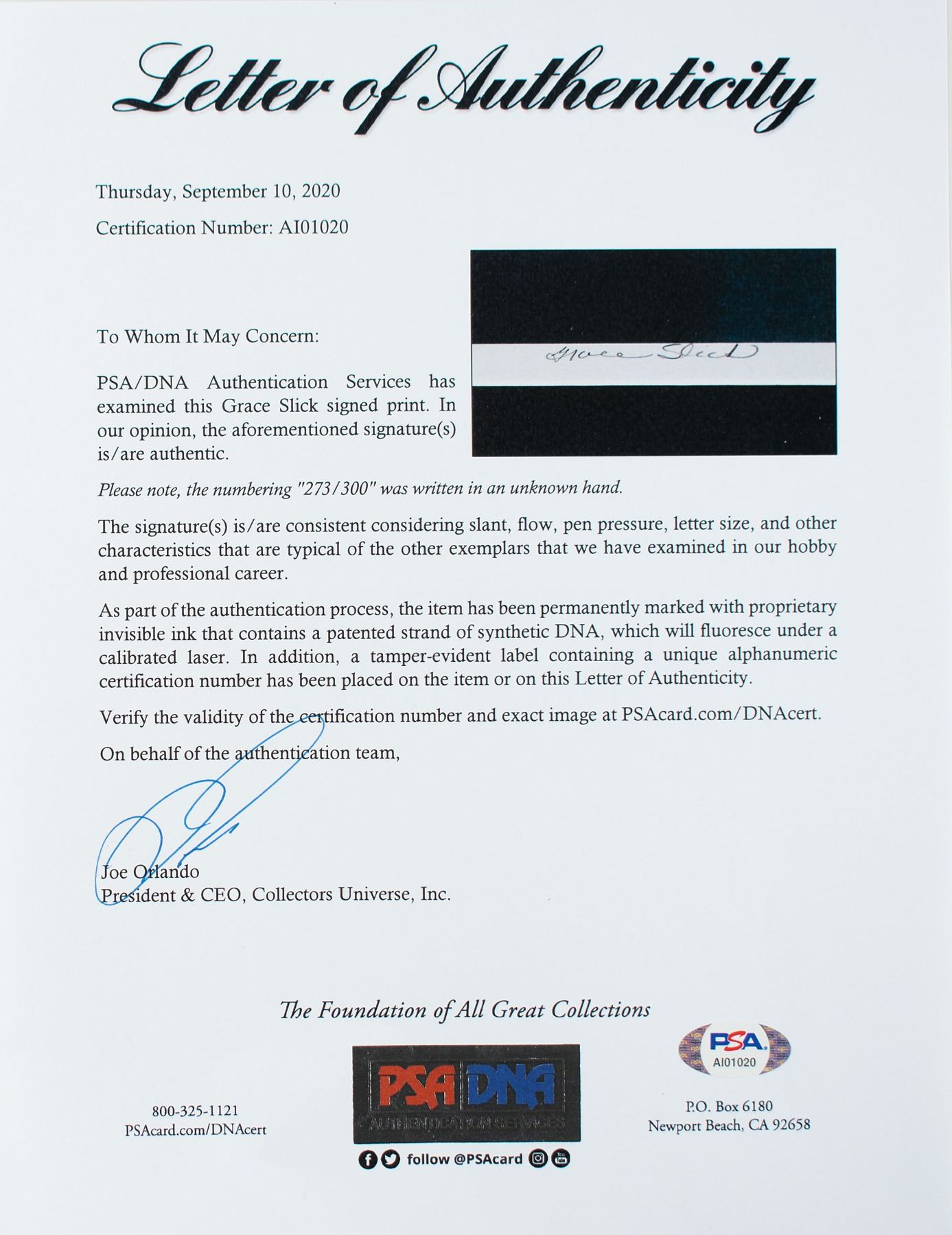 All lots sold by RR Auction are accompanied by an Auction Certificate ("AC”). On any lot presented with an AC issued by RR Auction, the certification is only as to its attribution to the person or entity described or to the lot's usage and only as explicitly stated therein (the "Certification of Authenticity”), to the exclusion of any other warranties, express or implied, including but not limited to those pursuant to the Uniform Commercial Code. The Certification of Authenticity inures only to the original Bidder (as shown in RR Auction's records). Bidder may not transfer, assign, or otherwise convey the Certification of Authenticity, and such purported transfer, assignment, or conveyance shall be null and void. The Certification of Authenticity is valid from date of the Auction in which Bidder was awarded the lot (the "Auction Date”) until five (5) years after the Auction Date, without exception.