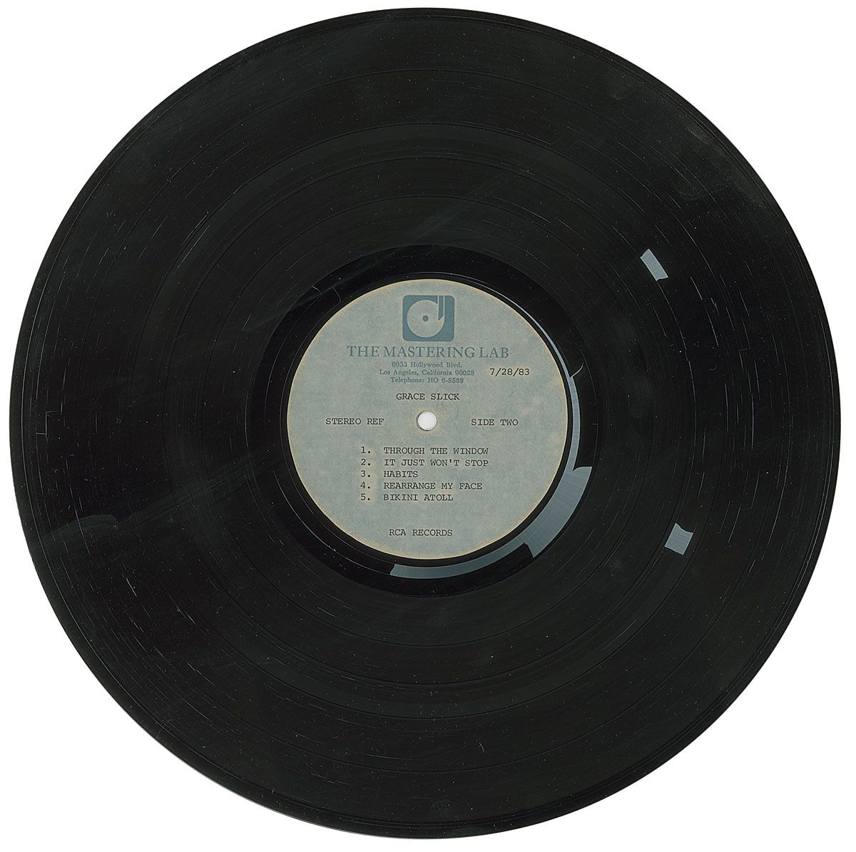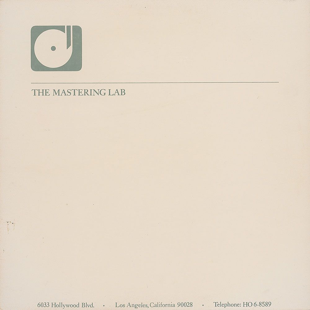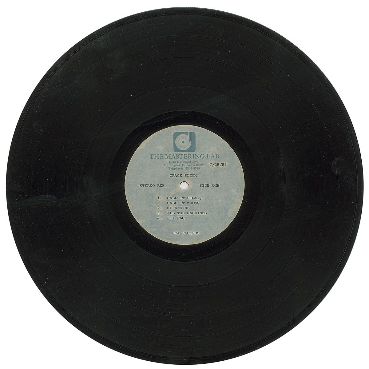 RCA Records double-sided 12? acetate of Slick’s 1984 album Software, each side featuring songs that correspond with those appearing on the final record. Identified in type on The Mastering Lab labels with relevant track listings and artist info, and dated July 28, 1983 (six months before the album’s release). Side one in fine condition; side two in very good condition, with surface flaking to a few areas of the recorded section. Accompanied by the original sleeve from The Mastering Lab.