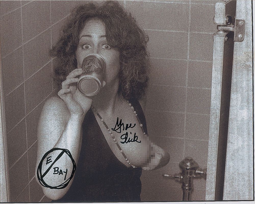 Glossy 10 x 8 photo of Slick drinking a beer in a bathroom stall and flashing one of her breasts, signed in black felt tip and adding a “No Ebay,’ reference in the lower left. In fine condition.