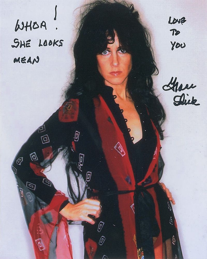 Color satin-finish 8 x 10 photo of Slick, signed in black felt tip, “Whoa! She looks mean, Love to you, Grace Slick.” In fine condition.