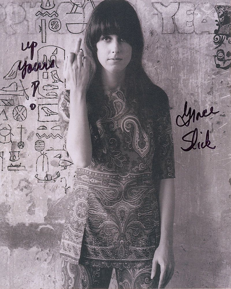 Edgy glossy 8 x 10 photo of Slick dressed in a paisley outfit and giving the middle finger, signed in black felt tip, “Up yours! Grace Slick.” In fine condition.