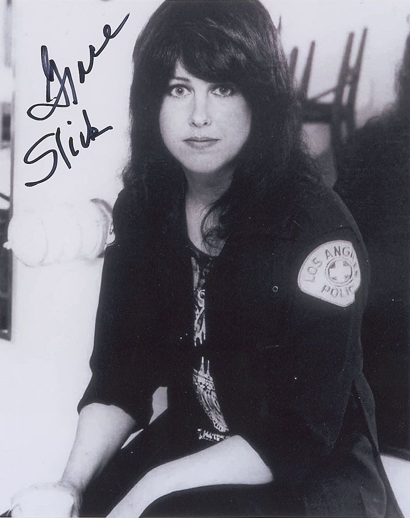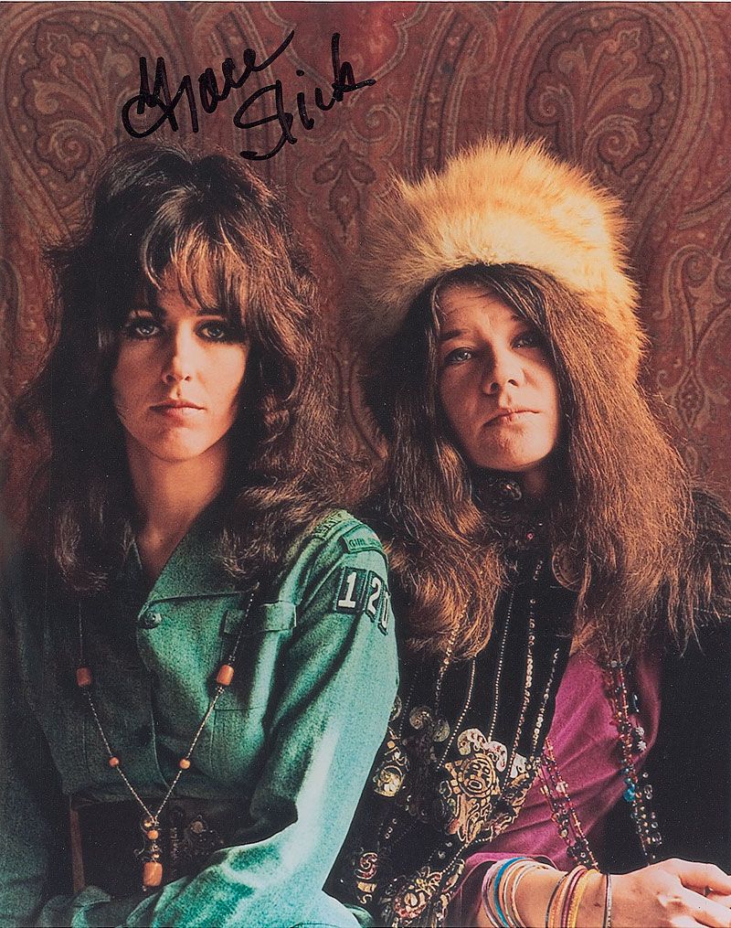 Two satin-finish 8 x 10 photos of Slick from earlier in her career, including one of Slick posing with Janis Joplin, each signed in black felt tip. In very fine condition.