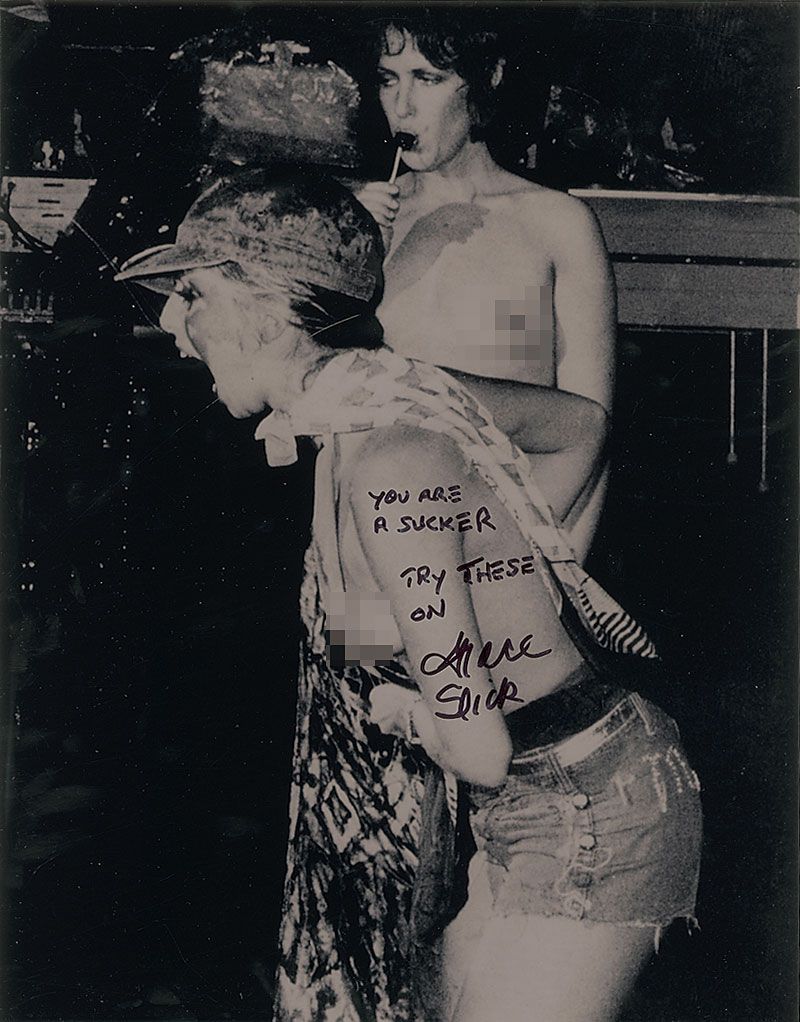 Unusual glossy 11 x 14 photo of a topless Slick sucking on a lollipop in front of another rowdy, and topless, woman, signed in black felt tip, “You are a sucker, Try these on, Grace Slick.” In fine condition.