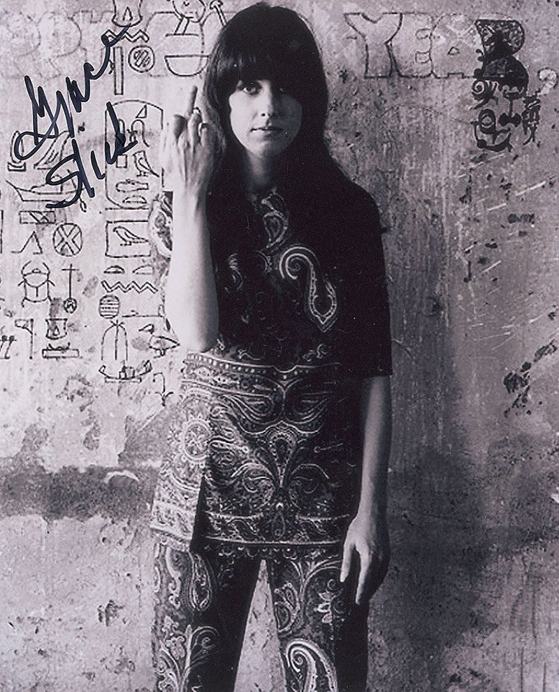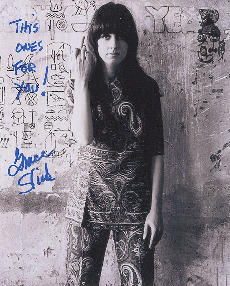 Two identical signed photos of a young Slick sticking up her middle finger, one signed in black felt tip and one signed in blue felt tip, with Slick adding “This one’s for you!” In very fine condition.