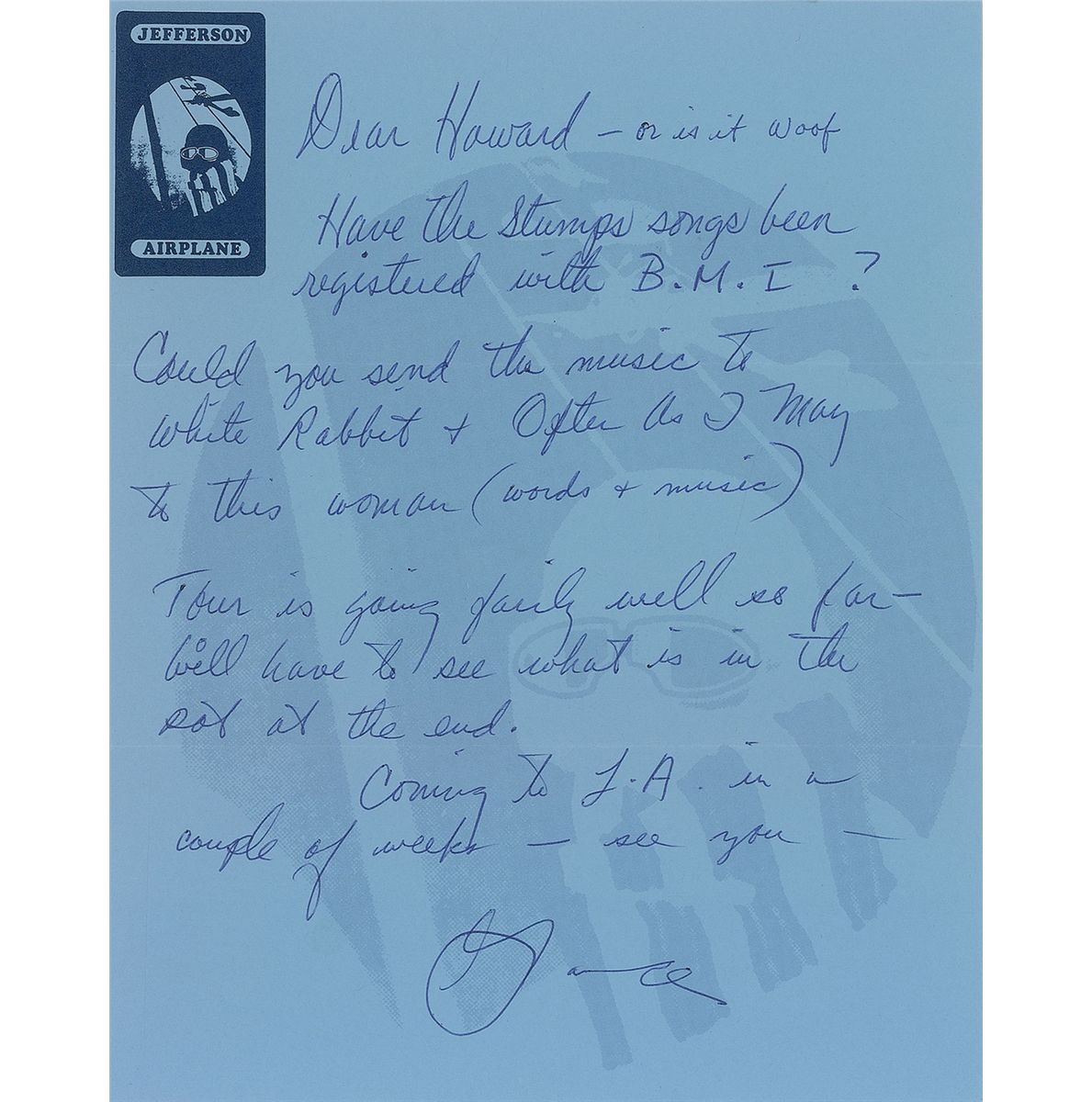 Rare ALS signed “Grace,” one page, 6.75 x 8.75, illustrated Jefferson Airplane letterhead, no date [but circa 1967]. Letter to her music publisher, Howard Wolf. In full: “Have the Stumps songs been registered with B. M. I.? Could you send the music to White Rabbit & Often As I May to this woman (words & music). Tour is going fairly well so far—will have to see what is in the pot at the end. Coming to L. A. in a couple of weeks—see you.” In fine condition. Accompanied by a letter from Wolf explaining his relationship with Slick, who often spoke to him about leaving the group, with Wolf convincing her to stay. A very rare offering, mentioning her original publisher—Stumps Music Publishing—as well as one of the band’s biggest songs, and Slick’s reluctance to stay with the band.