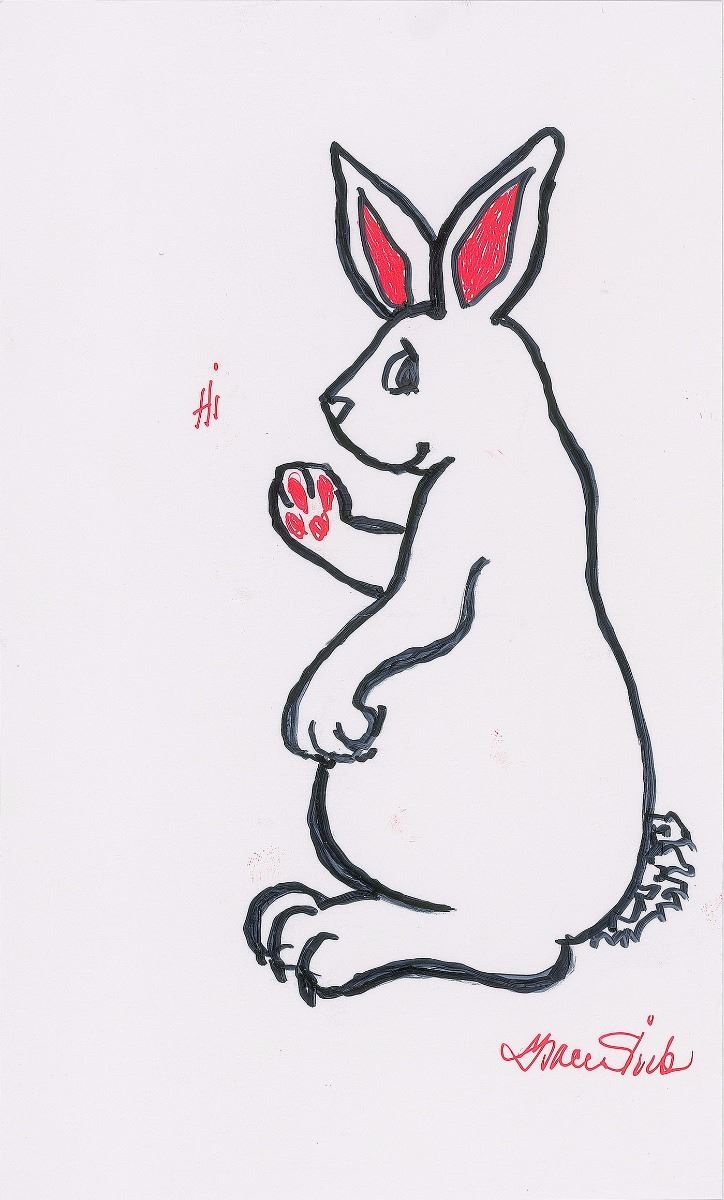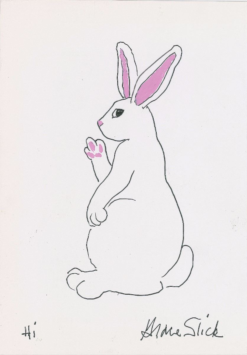 Two original ink and paint sketches of a white rabbit waving and saying “Hi” on individual 6 x 8.5 and 5.25 x 8.5 cardstock sheets, both drawn by Slick who signs below. In overall fine condition.