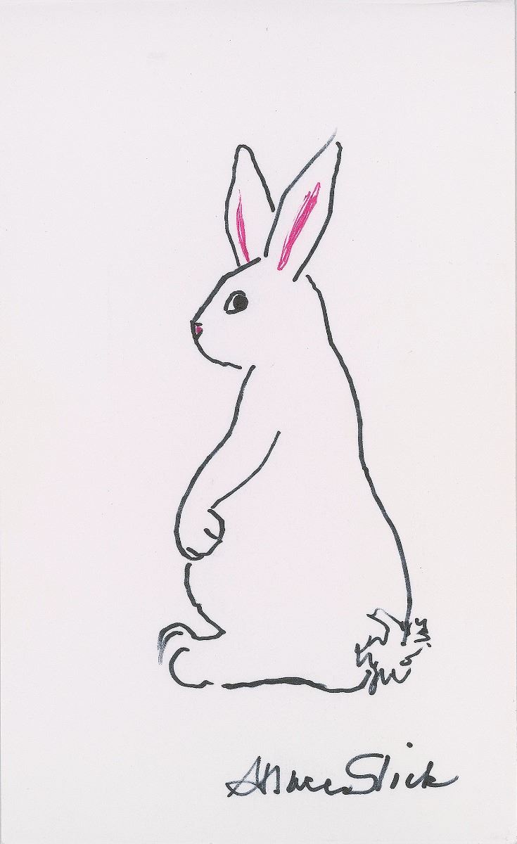 Original signed ink and felt tip sketch of a white rabbit peering over its shoulder, drawn by Slick on a white 5.25 x 8.5 cardstock sheet, signed below in black felt tip. In very fine condition.