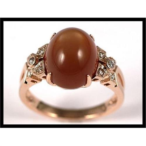 The pretty lady's 18K rose gold ring containing with 1 orange color moonstone weighing approximately 6.55 carats. 10 full cut diamonds are also set on this ring with an estimated total weight of 0.09 carats. This sized 7 ring weights 5.80 grams.