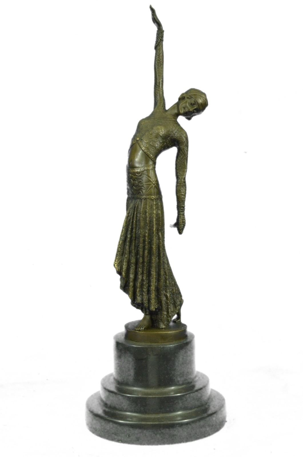 This gorgeous dancer wears a long flowing skirt that has intricate detail that that falls all over her skirt and looks like the scales of a fish. She extends her hands up towards the sky and one towards the earth. Her head is tilted off to the side and she leans back exposing her belly. She has a sweet face with soft facial features. On her head she wears a head wrap that matches with her ensemble. This bronze sculpture was cast using the Lost Wax Method and has a brown patina. Bronze Dimensions with Marble Base: Height 15 X Width 5 inches. Weight: 8 LBS.