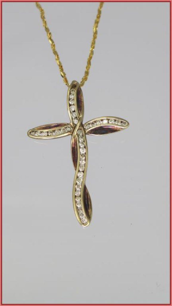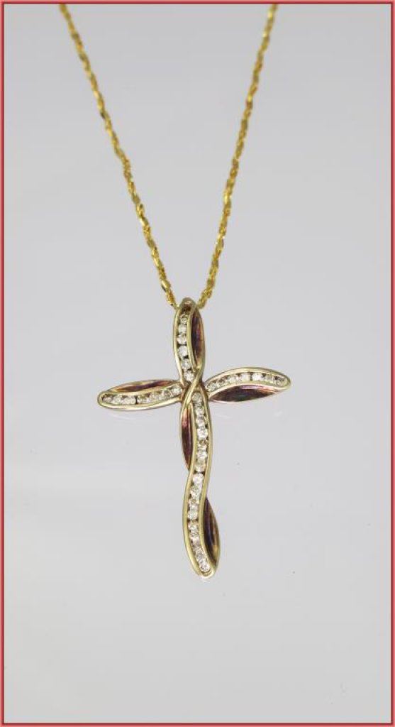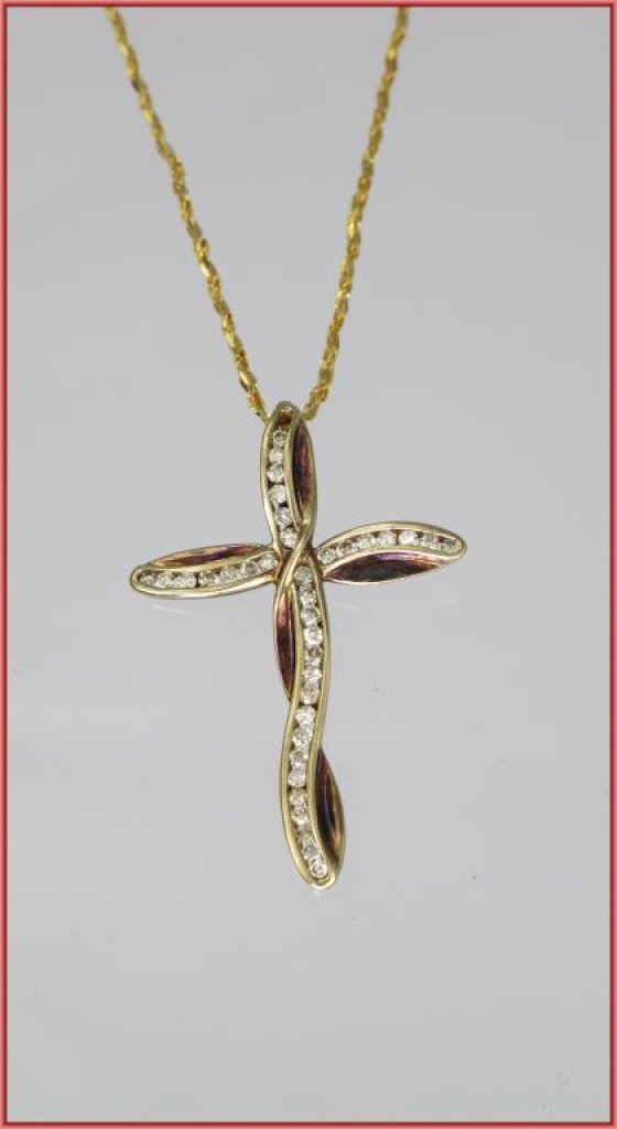 Graceful Diamond Cross Pendant with 36 round cut channel set Diamonds weighing approx. 0.60 with H-I colors and VS/SI clarity measures 1” x 1.5” set in 10 karat yellow gold. Retail $1,000-$1,400 Estimate $600-$900