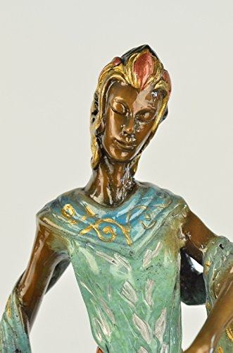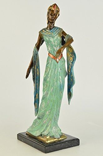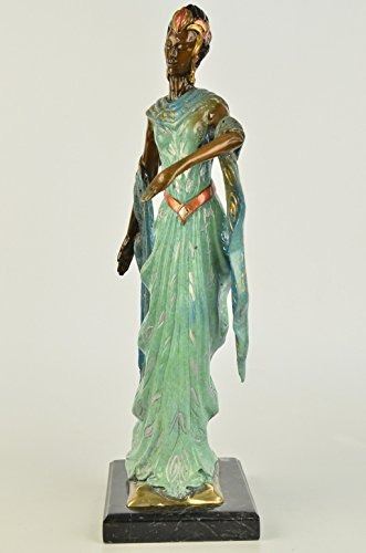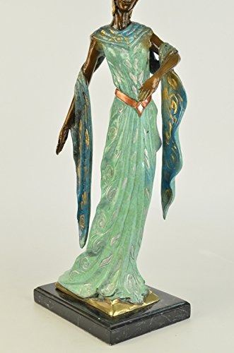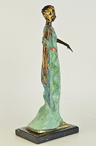 This Graceful Bronze Princess Is Exquisitely Handmade Complete With Egyptian Symbols Reflecting The PeriodS Fascination With The Excavation Of TutankhamenS Tomb. The Base Forms A Natural Pairing To The Sculpture Becoming Part Of The Design And Form. She Wears A Headdress Of Extravagant Metal And Jewels. She Wears Belt Decorating Her Long Gown, Exposing Her Slender Body, And The Most Beautifully Detailed Skirt. The Skirt Falls Long To Her Knees, She Wears A Scarf Type Cover Up For Her Head And Nice Calve High Boots. Made Of Bronze And Cast Using The Ancient Lost Wax Method. Multi Color Special Patina Finish On A Solid Black Marble Base. Bronze dimensions with marble base: Height 19 X Width 8 inches. Weight: 12 lbs.Please Note: This is a reproduction bronze sculpture from the original molded and signed. This featured bronze sculpture is a recast after the original, and has been done recently. This 100% bronze sculpture is an abstract piece certain to be a conversation piece.Please Note: This is a reproduction bronze sculpture from the original molded and signed. This featured bronze sculpture is a recast after the original, and has been done recently. This 100% bronze sculpture is an abstract piece certain to be a conversation piece.